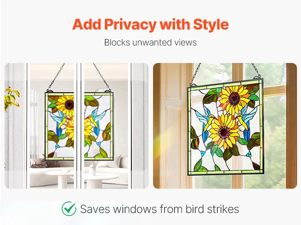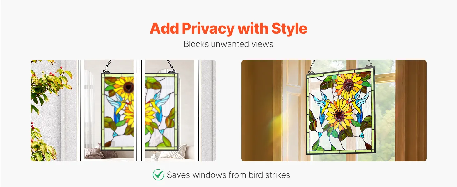 Ten wiszący panel witrażowy chroni Twoje pomieszczenia przed ciekawskimi spojrzeniami i dodaje im jasności – idealny do okien wychodzących na ulicę lub sąsiadów. Chroni również przed kolizjami z ptakami i stanowi delikatną warstwę ochronną.