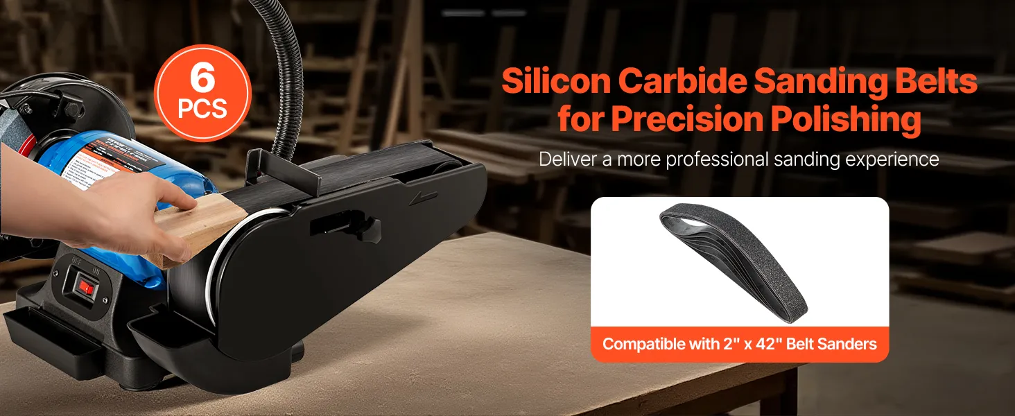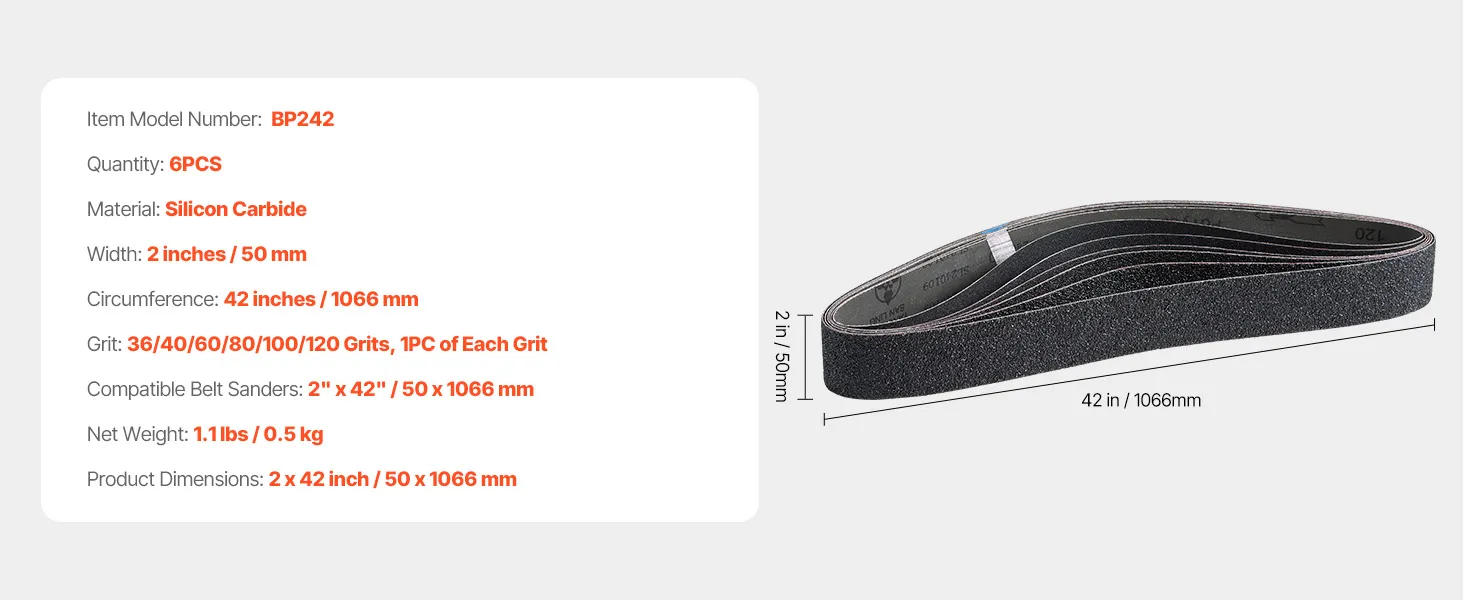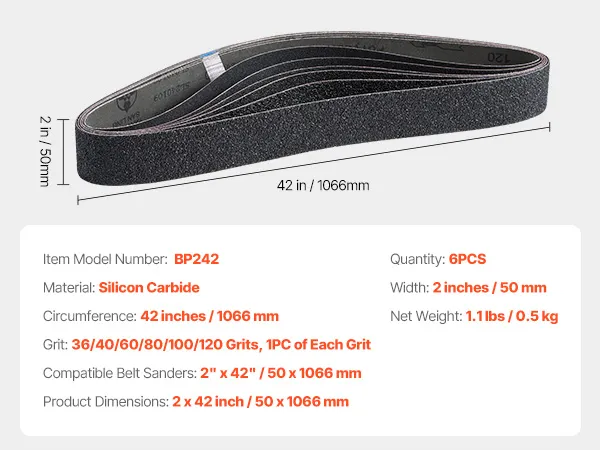 Paski ścierne VEVOR, 50 x 1066 mm, 6 sztuk (ziarnistość 36/40/60/80/100/120), wykonane z węglika krzemu, papier ścierny taśmowy, do obróbki metali, materiałów kompozytowych i wykańczania tworzyw sztucznych