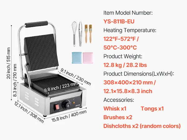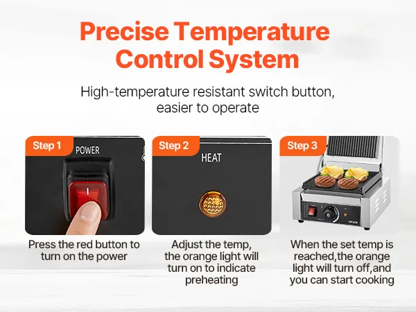 Precyzyjna kontrola temperatury: Grill z prasą do kanapek jest wyposażony w pokrętła do regulacji temperatury w zakresie od 50°C do 300°C (122°F do 572°F). Konstrukcja ta spełnia wymagania dotyczące gotowania różnych potraw. Dioda LED sygnalizuje stan nagrzewania.