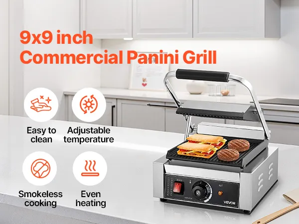 Grill kontaktowy VEVOR Commercial Panini o mocy 1800 W do kanapek, steków, bekonu, hamburgerów, opiekacz do kanapek, grill ze stali nierdzewnej z uchwytem i kontrolą temperatury oraz płytą grzewczą 22 x 23 cm, opiekacz do panini