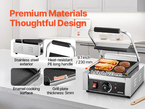 Wytrzymały i trwały: Ten komercyjny grill do panini ma obudowę ze stali nierdzewnej i wzmocnioną, emaliowaną płytę grillową. Wydłużony uchwyt ABS zapobiega poparzeniom, a antypoślizgowe nóżki zapewniają dodatkowe bezpieczeństwo.