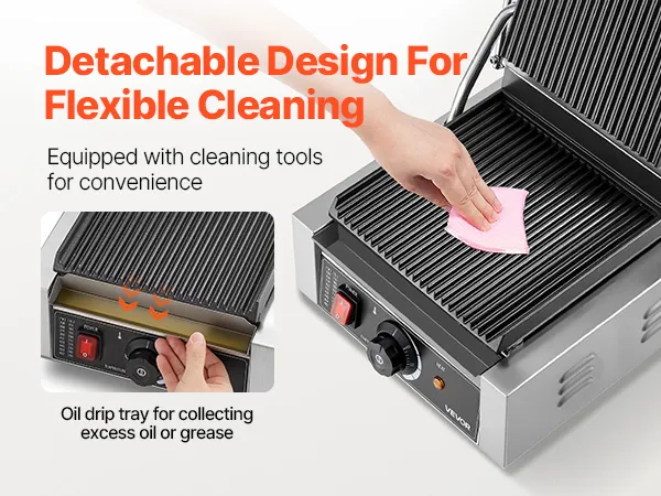 Łatwe czyszczenie: Ten grill kontaktowy jest wyposażony w wyjmowaną tackę ociekową, która ułatwia zbieranie starego oleju i jego pozostałości. Konserwacja jest prosta za pomocą skrobaka i suchej ściereczki. Liczne otwory wentylacyjne po obu stronach skutecznie odprowadzają ciepło.