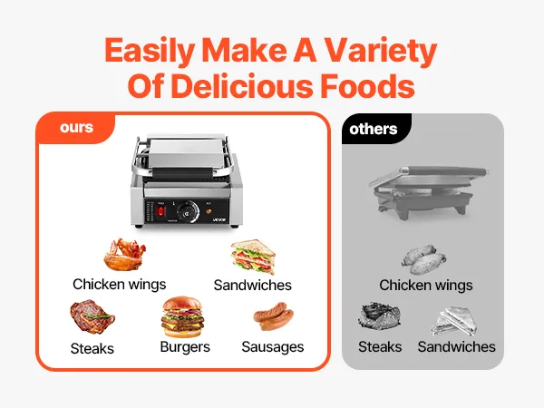 Nasz komercyjny grill panini nadaje się do przygotowywania różnorodnych potraw, dzięki czemu jest wielofunkcyjny i idealny na spotkania rodzinne, stoiska z jedzeniem, restauracje i wiele innych. Oferuje wszechstronne możliwości gotowania, a jego kompaktowy rozmiar zapewnia dużo miejsca do gotowania, nie zajmując dużo miejsca na blacie.