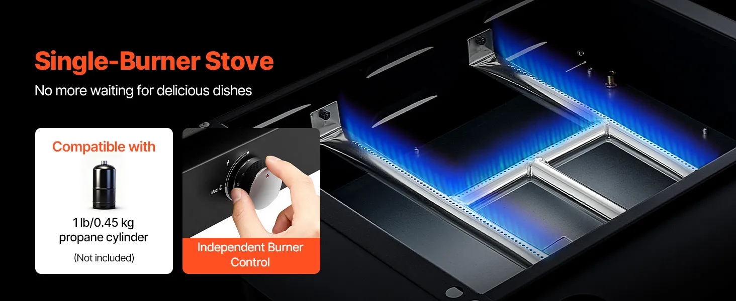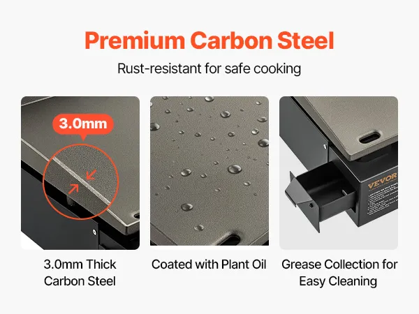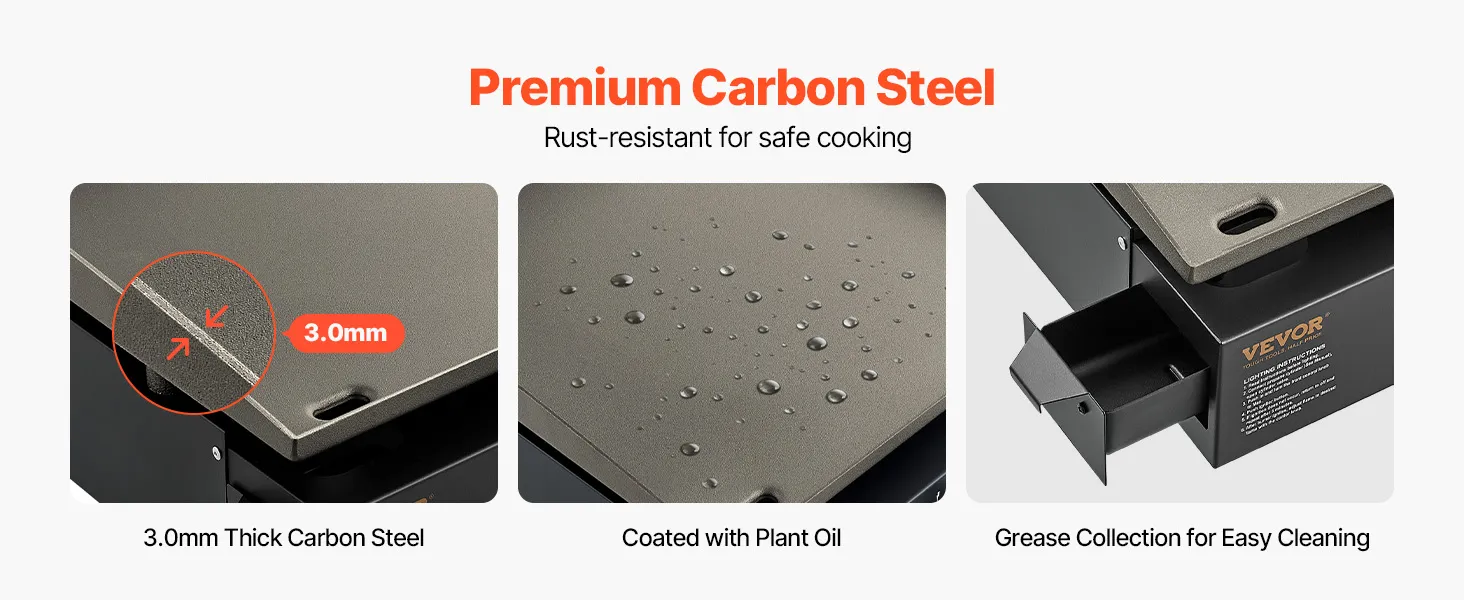 • Trwały materiał: Ten dostępny w sprzedaży płaski grill jest wykonany z walcowanej na gorąco stali dla zwiększenia stabilności i pokryty olejem roślinnym, aby zapobiec rdzewieniu i zapewnić zdrowsze i bezpieczniejsze gotowanie. Palniki wykonane są ze stali nierdzewnej i wytrzymują wysokie temperatury bez odkształceń.