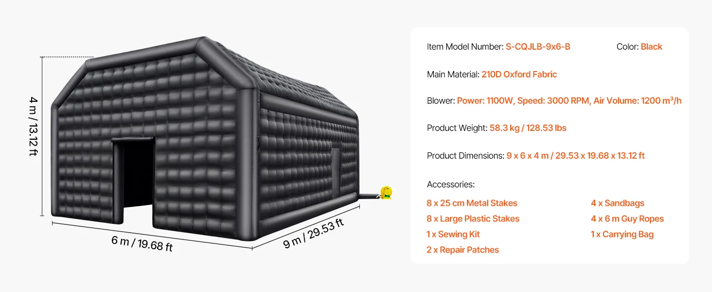 Materiały o wysokiej wytrzymałości: Ten nadmuchiwany namiot imprezowy jest wykonany z wytrzymałej tkaniny Oxford 210D, jest wiatroszczelny i odporny na nieoczekiwane zmiany pogody (lekki deszcz lub wiatr), zapewniając płynny przebieg imprezy. Uwaga: Produkt nie jest wodoodporny, a jedynie wodoodporny.