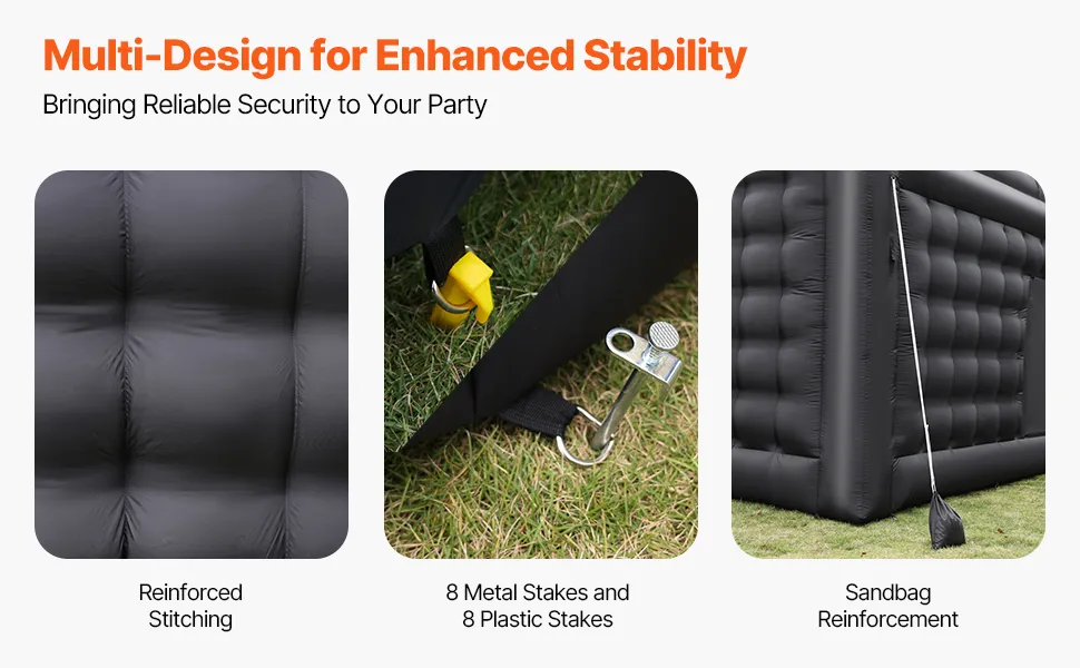 • Trwała konstrukcja: Ten nadmuchiwany namiot imprezowy został wykonany z wysokiej jakości tkaniny Oxford 210D, jest wiatroodporny i trwały. W zestawie znajdują się śledzie mocujące, liny odciągowe i worki z piaskiem zapewniające stabilność.