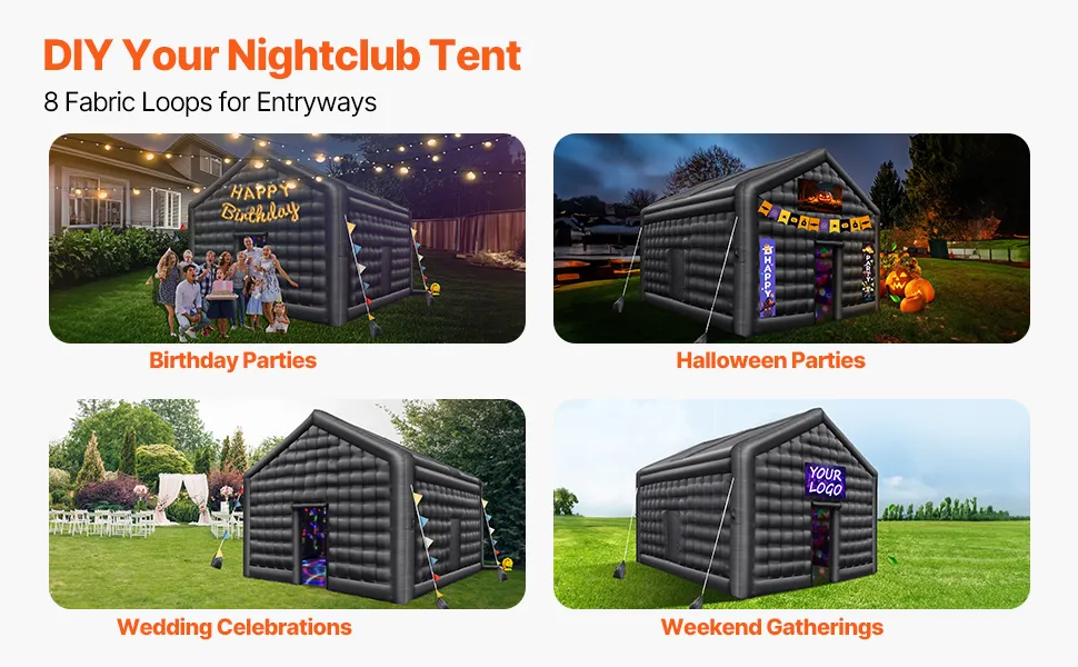 Ten nadmuchiwany namiot klubowy oferuje mnóstwo miejsca na huczne imprezy i sprawia, że imprezy stają się jeszcze bardziej ekscytujące. Idealny na wesela, spotkania towarzyskie, urodziny i imprezy halloweenowe.