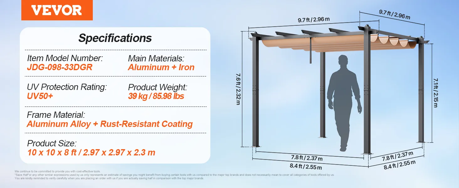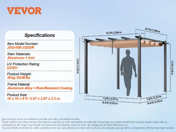 Dach odporny na warunki atmosferyczne: Górny dach pergoli wykonany jest w 100% z zagęszczonej tkaniny poliestrowej, pokrytej powłoką PA Level 5+, zapewniającą doskonałą wodoodporność i ochronę przeciwsłoneczną UV50+, skutecznie blokując 98% promieniowania UV. Materiał dachu jest trwały i odporny na blaknięcie. Uwaga: Nie zaleca się stosowania dachu w ekstremalnych warunkach pogodowych, takich jak silny wiatr lub ulewny deszcz.