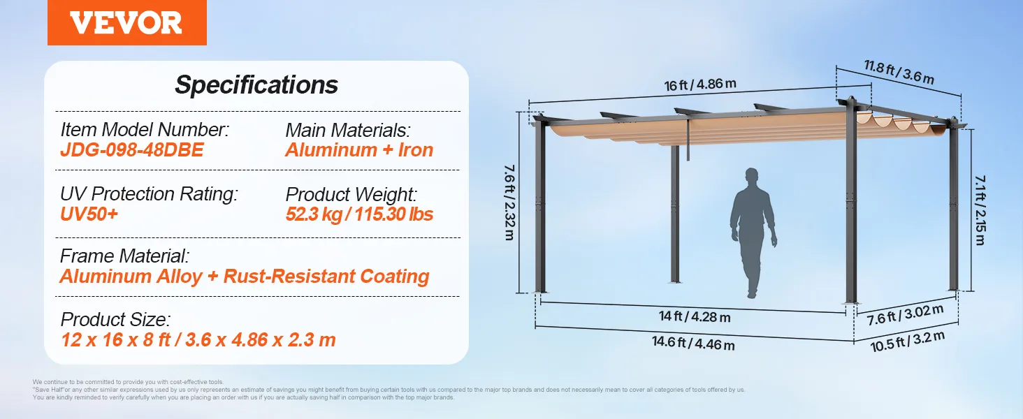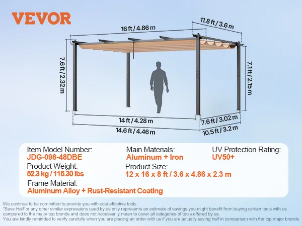 Regulowany daszek przeciwsłoneczny: Zintegrowana konstrukcja szyny ślizgowej umożliwia łatwą regulację chowanego daszka, co pozwala na dostosowanie obszaru zacienienia do potrzeb. Niezależnie od tego, czy są upalne letnie dni, czy lekki deszcz, ta pergola zapewnia idealny cień i ochronę, gwarantując komfort na świeżym powietrzu.