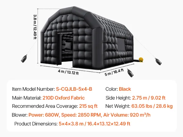 Nadmuchiwany namiot imprezowy VEVOR 5x4x3,8 m, namiot sześcienny do dyskoteki, namiot weselny typu pawilon z dmuchawą 680 W, workiem z piaskiem, 2 oknami na imprezy, urodziny, wesele, czarny