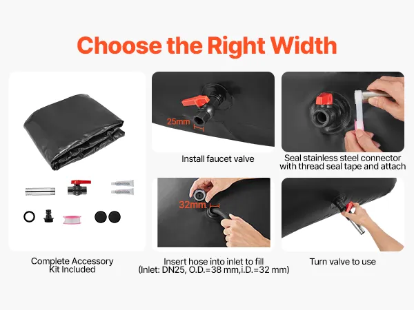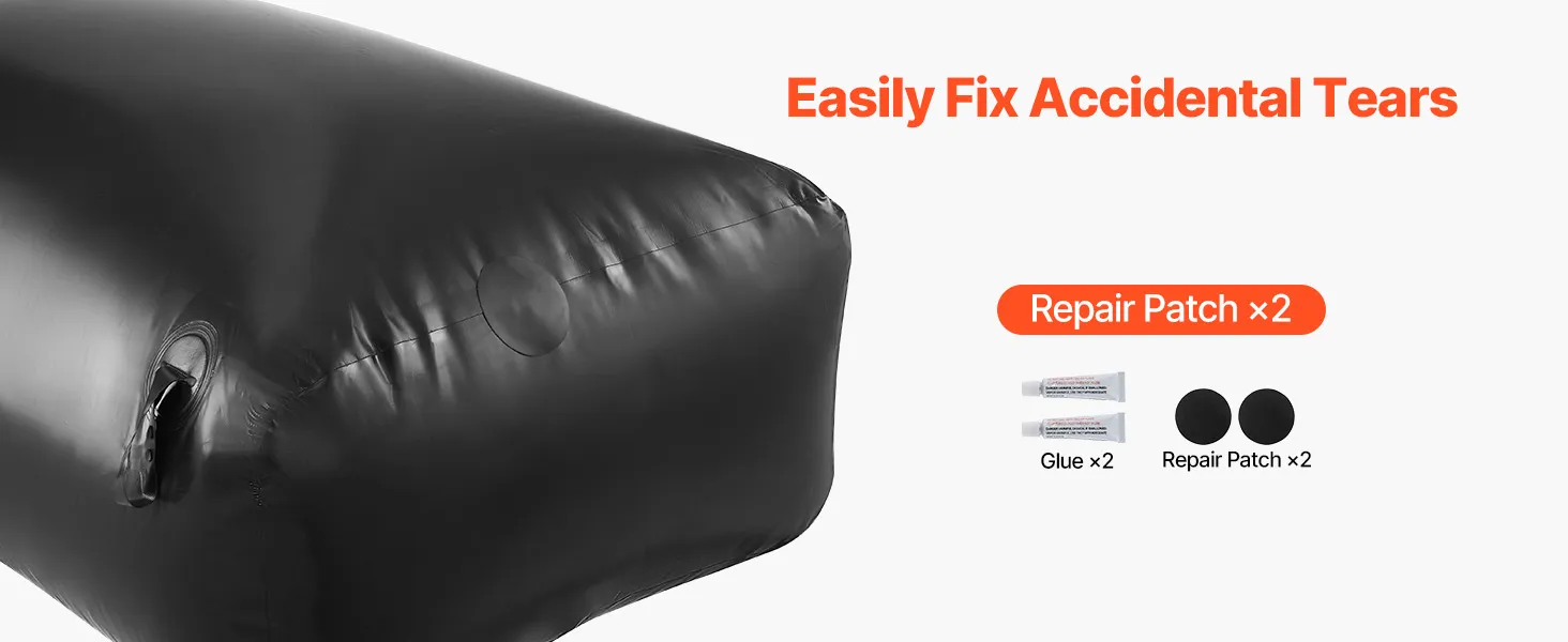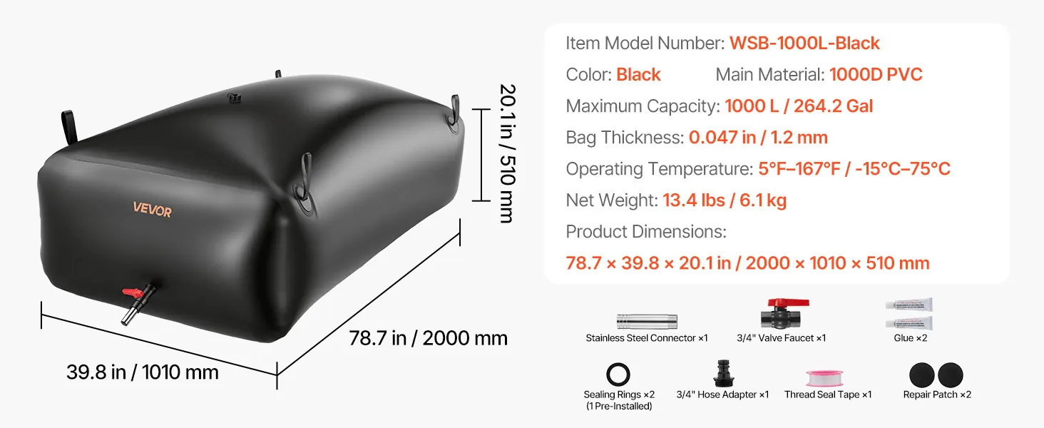 Worek do przechowywania wody o pojemności 1000 litrów: Nasz worek do przechowywania wody z PVC ma wymiary 2000 x 1010 x 510 mm (78,7 x 39,8 x 20,1 cala) i mieści do 1000 litrów (264,2 galona) – idealny do nawadniania, zaopatrzenia w wodę w kamperze lub jako zapas wody w nagłych wypadkach. Zawiera kompletny zestaw akcesoriów i naprawczy, co ułatwia obsługę.