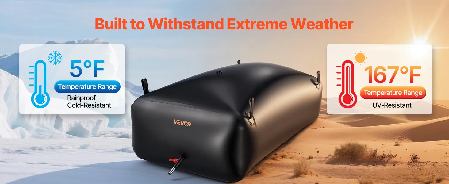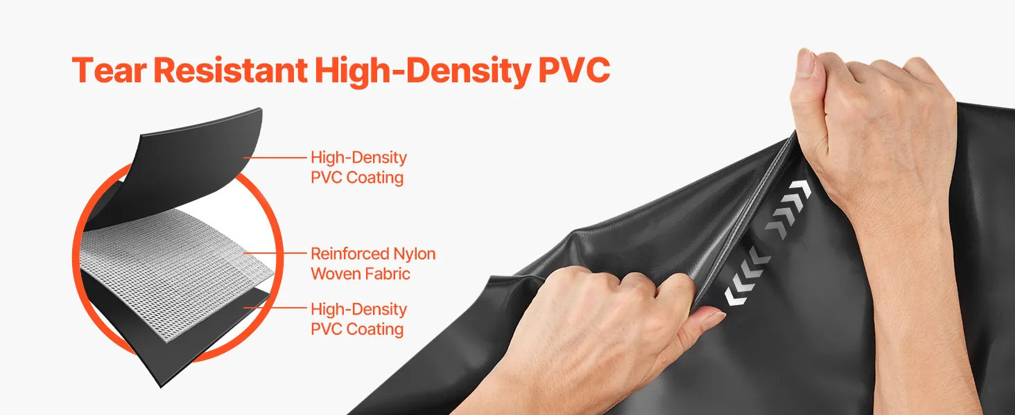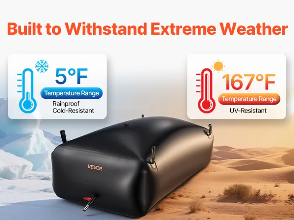 Dwuwarstwowy materiał 1000D PVC: Wykonany z grubej, dwuwarstwowej tkaniny 1000D z powłoką PVC i wzmocniony odporną na rozdarcia i ścieranie siateczką wewnętrzną, ten bukłak na wodę wytrzymuje temperatury od -15°C do 75°C (od 5°F do 167°F). Taka konstrukcja zapobiega starzeniu się bukłaka i wydłuża jego żywotność.
