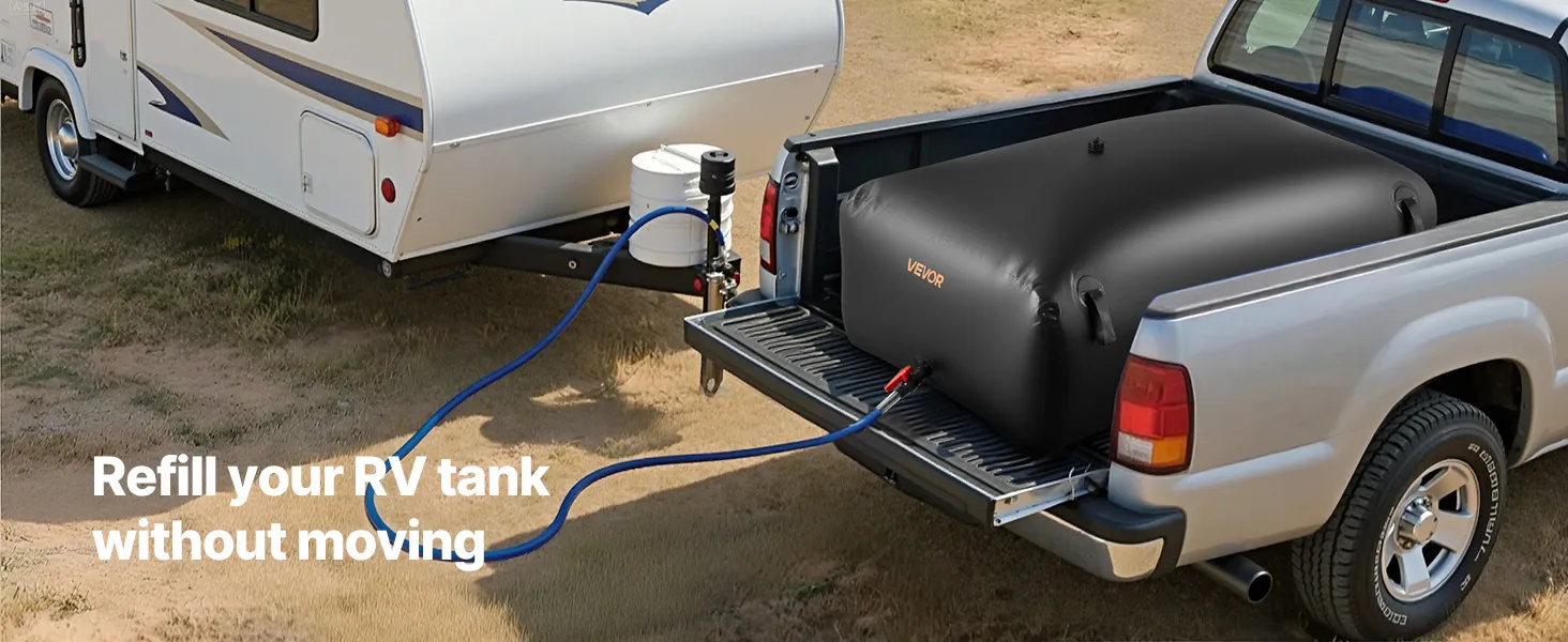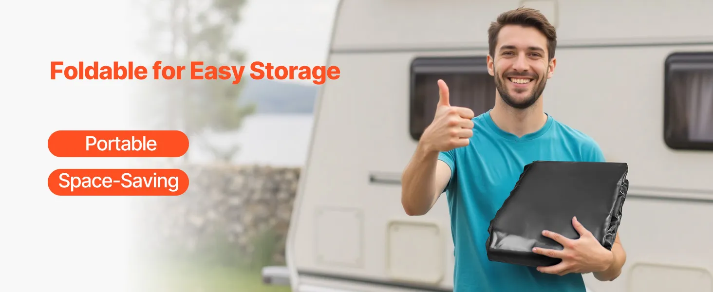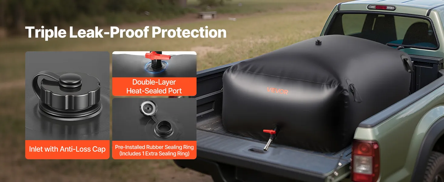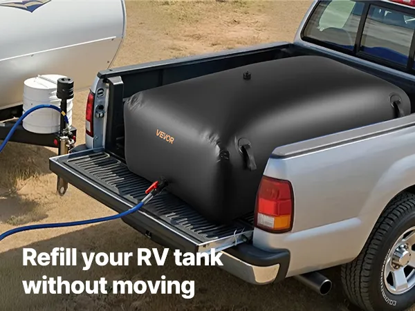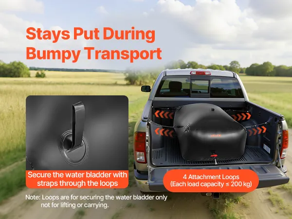 Przenośny i łatwy w przechowywaniu: Przenośny worek na wodę wyposażony jest w cztery wzmocnione paski nośne, które umożliwiają bezpieczne przymocowanie do skrzyni ładunkowej pickupów, SUV-ów lub dachu pojazdu, zapewniając bezpieczny transport. Elastyczny materiał PVC składa się na płasko, co pozwala na kompaktowe przechowywanie, gdy nie jest używany, eliminując potrzebę stosowania dużych zbiorników na wodę.