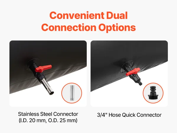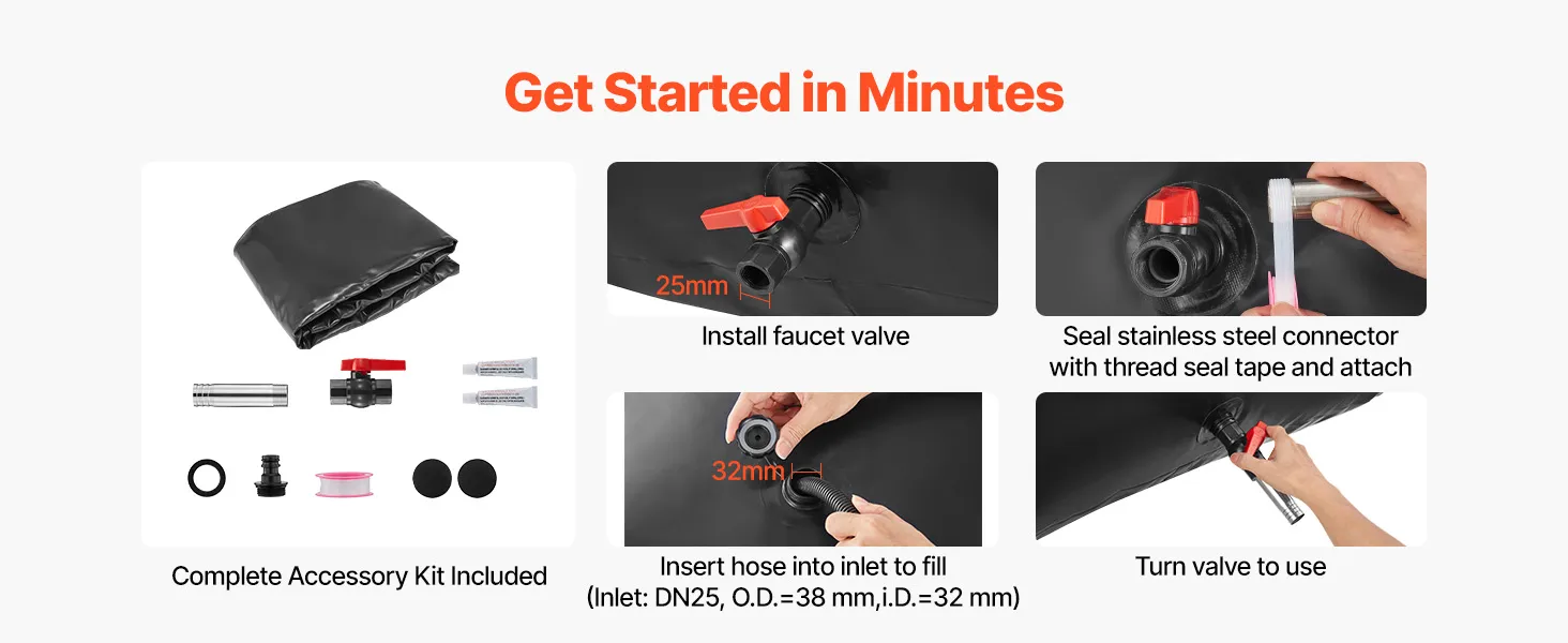 Łatwy w użyciu: Składany worek do przechowywania wody ma fabrycznie zainstalowane przyłącza wlotowe (DN25, gwint zewnętrzny 32 mm) i wylotowe (DN20, gwint zewnętrzny 25 mm). Wystarczy podłączyć kran do wylotu i podłączyć wąż ogrodowy, aby napełnić worek. Gotowy do użycia w kilka minut.