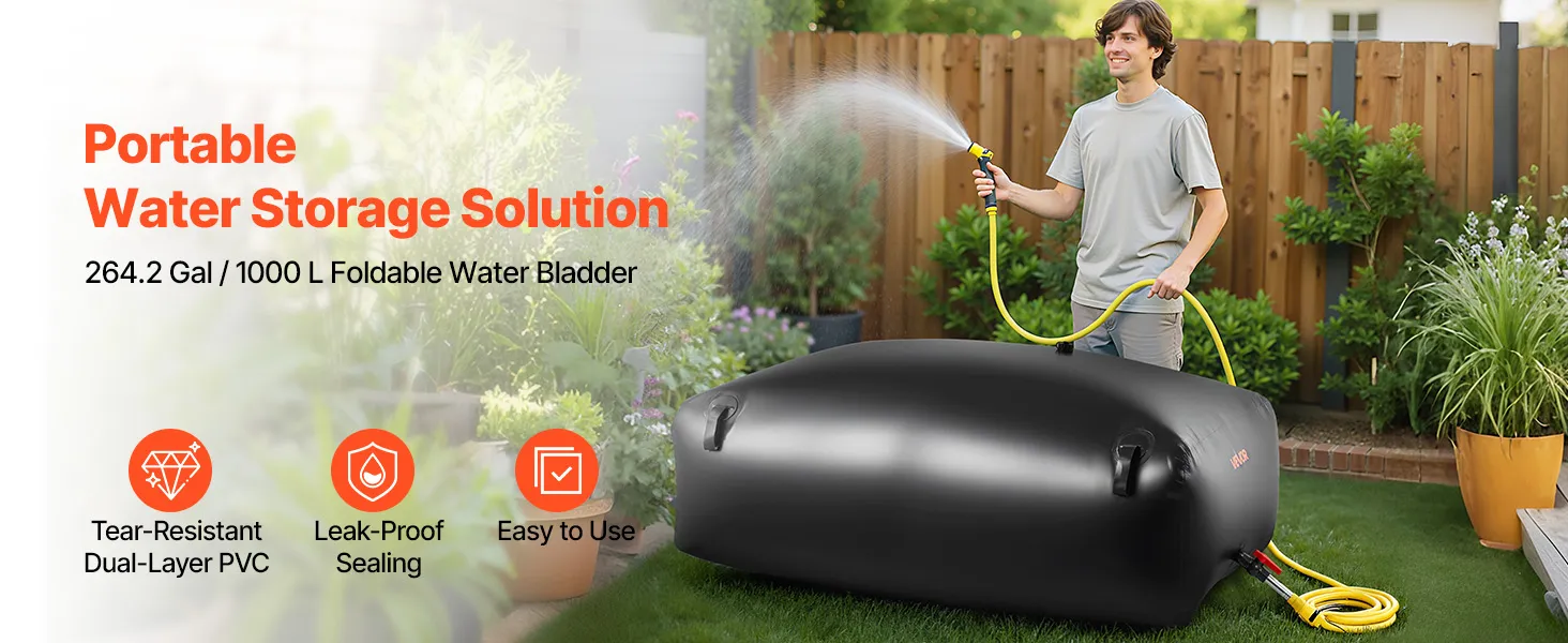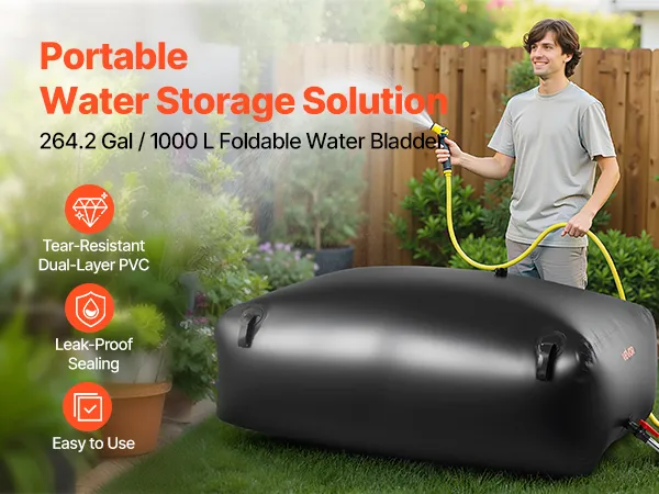 Składany bukłak na wodę o pojemności 1000 l (264,2 galona) to uniwersalne rozwiązanie do przechowywania wody, gwarantujące niezawodne zaopatrzenie w wodę na zewnątrz.