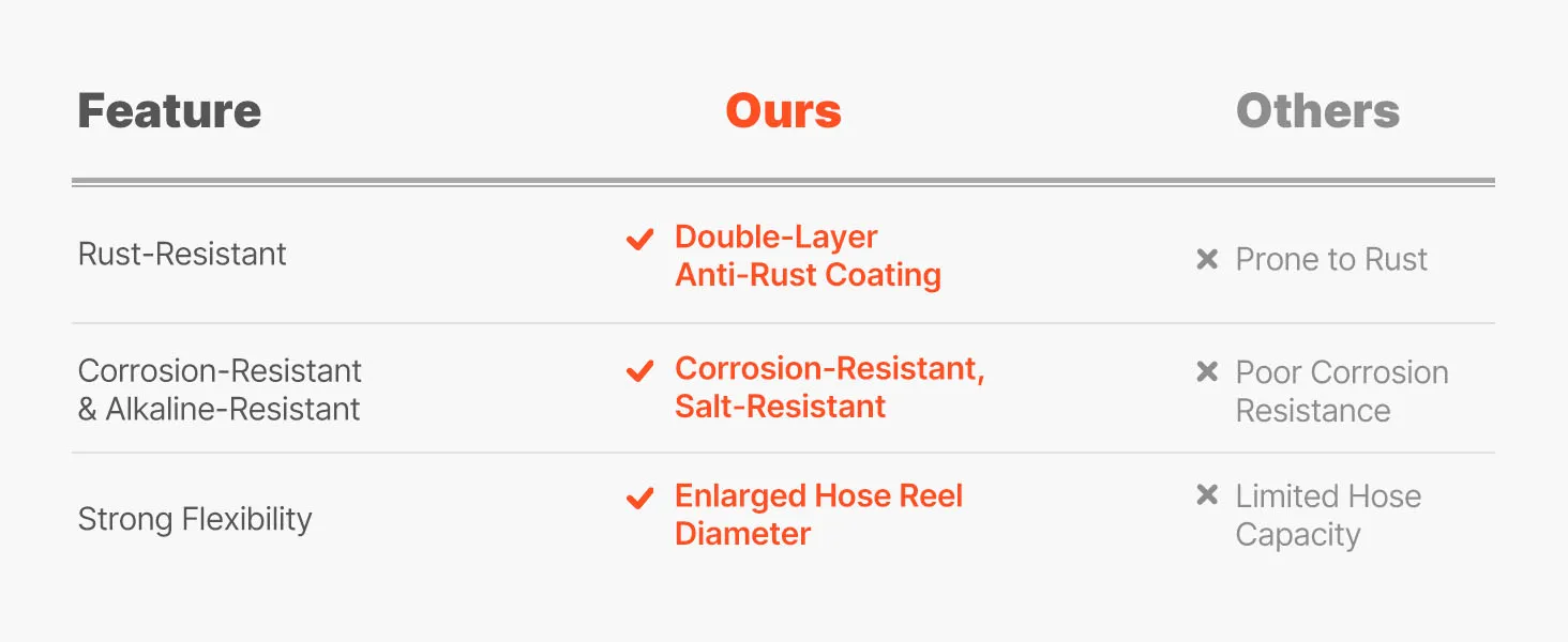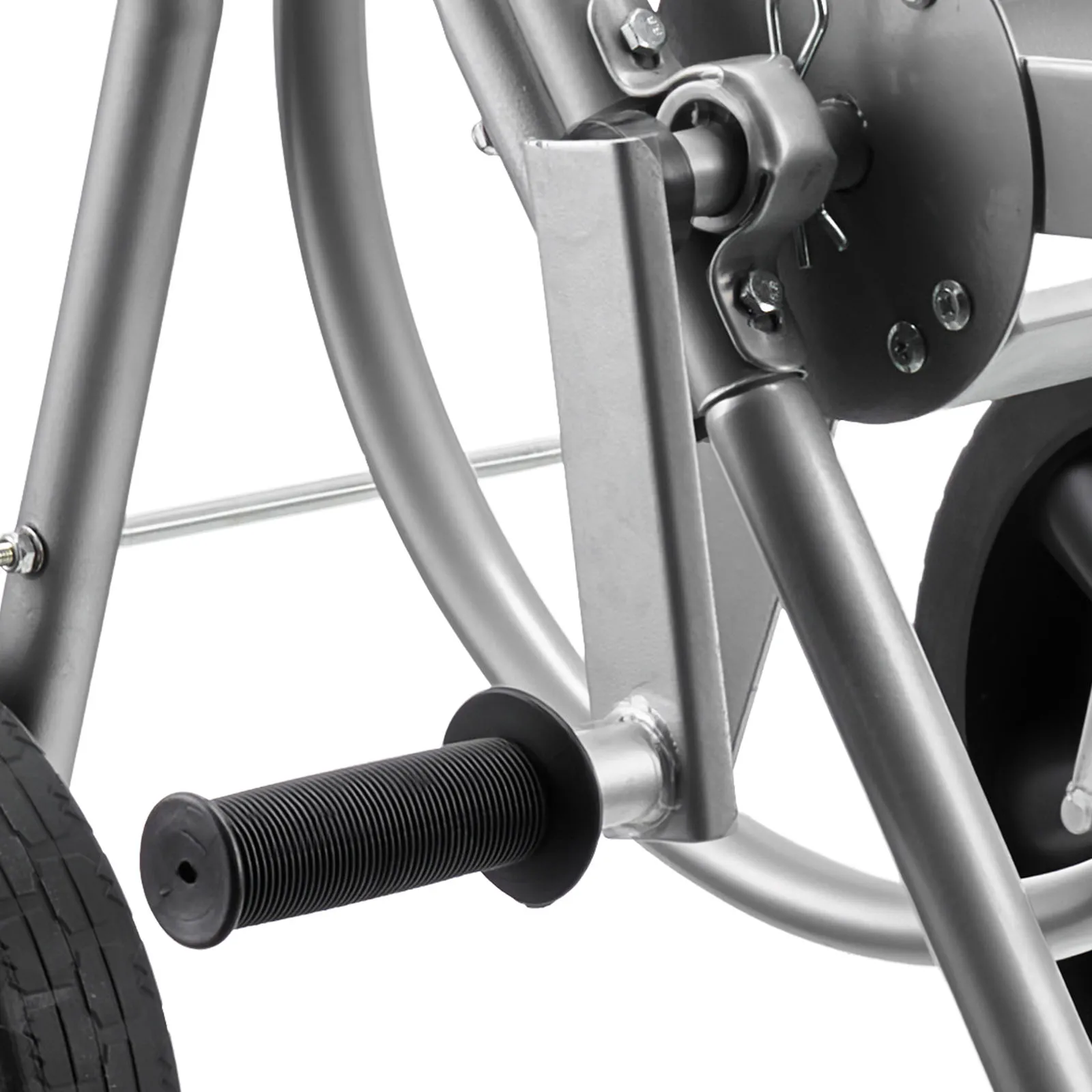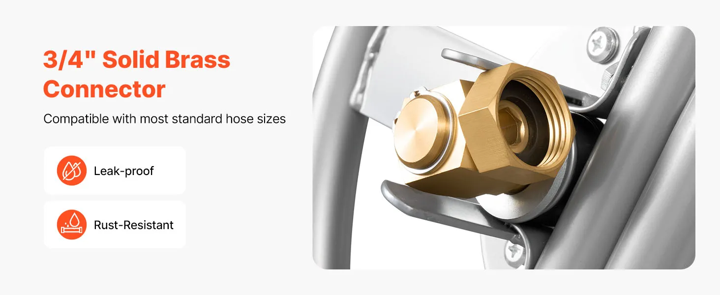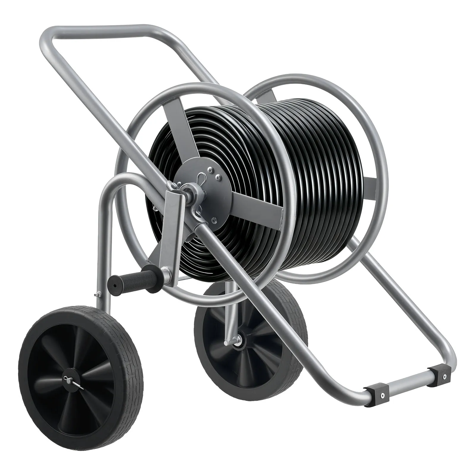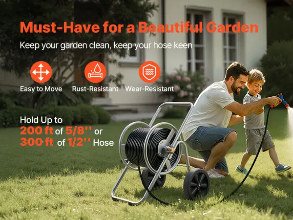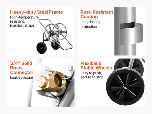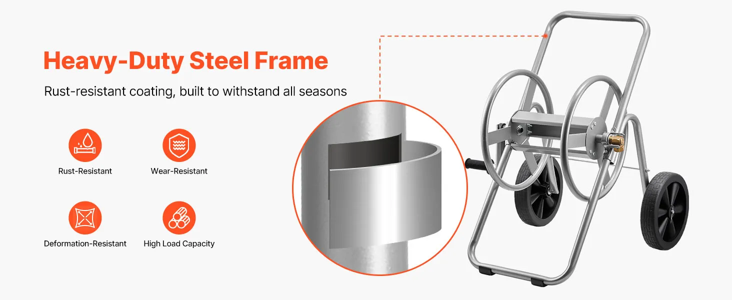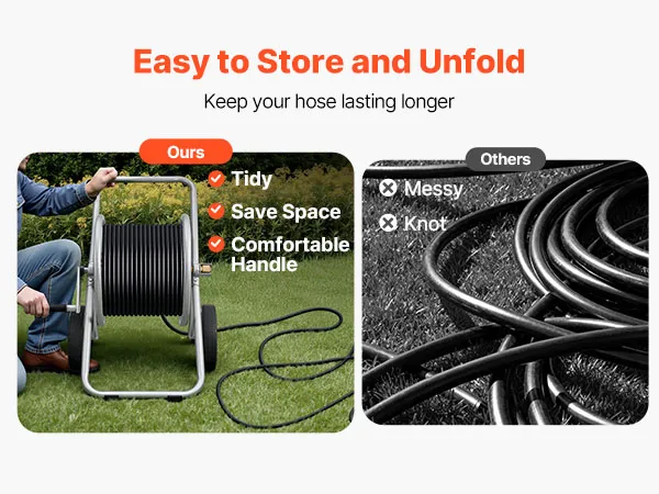 Ten bęben na wąż ogrodowy, wykonany ze stali Q235A z mosiężnymi łącznikami, mieści 9144 cm (300 stóp) węża o średnicy 12,7 mm (1/2 cala) lub 6096 cm (200 stóp) węża o średnicy 15,88 mm (5/8 cala). Mechanizm zwijania z przekładnią zębatą umożliwia łatwe zwijanie, a nisko położone i antypoślizgowe koła zapewniają stabilność na trawie, żwirze lub nierównym podłożu.