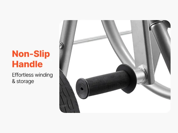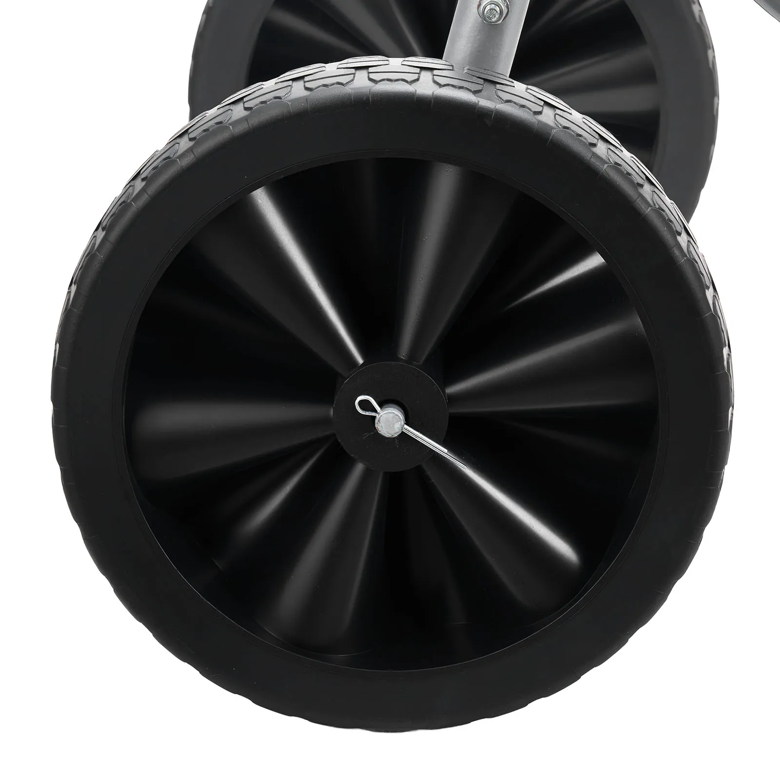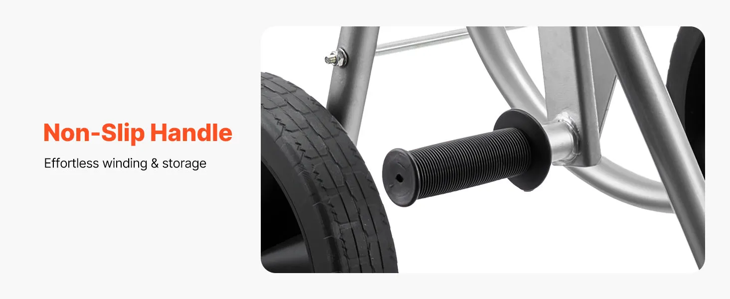Płynny ruch: Ten wózek na węże na kółkach wyposażony jest w antypoślizgowe koła i nisko osadzoną ramę, co pozwala na bezpieczne poruszanie się po trawnikach, żwirze i nierównym terenie. Jego solidna konstrukcja zapewnia stabilność pod dużym obciążeniem i umożliwia łatwy transport węży bez przewracania się i dodatkowego wysiłku.