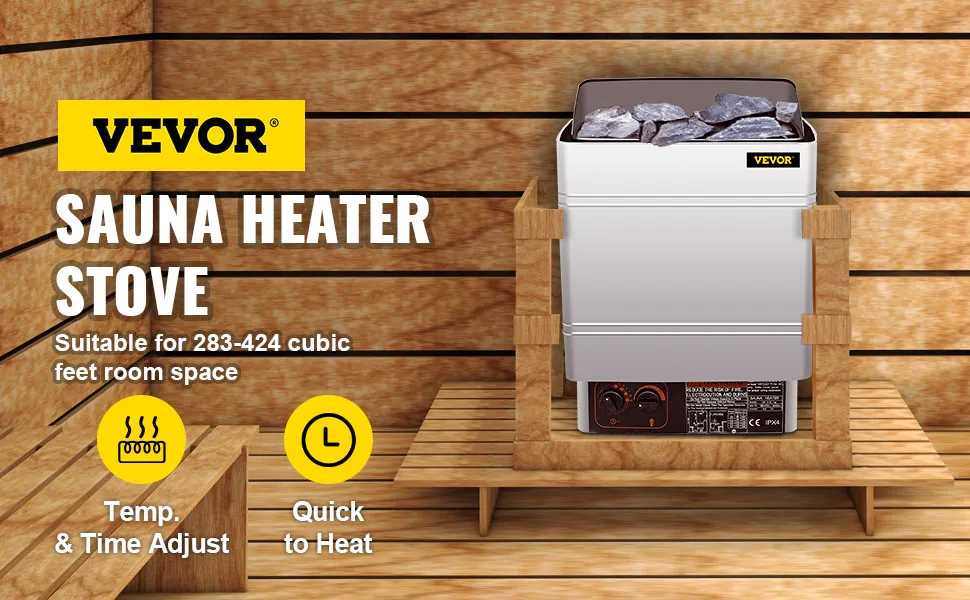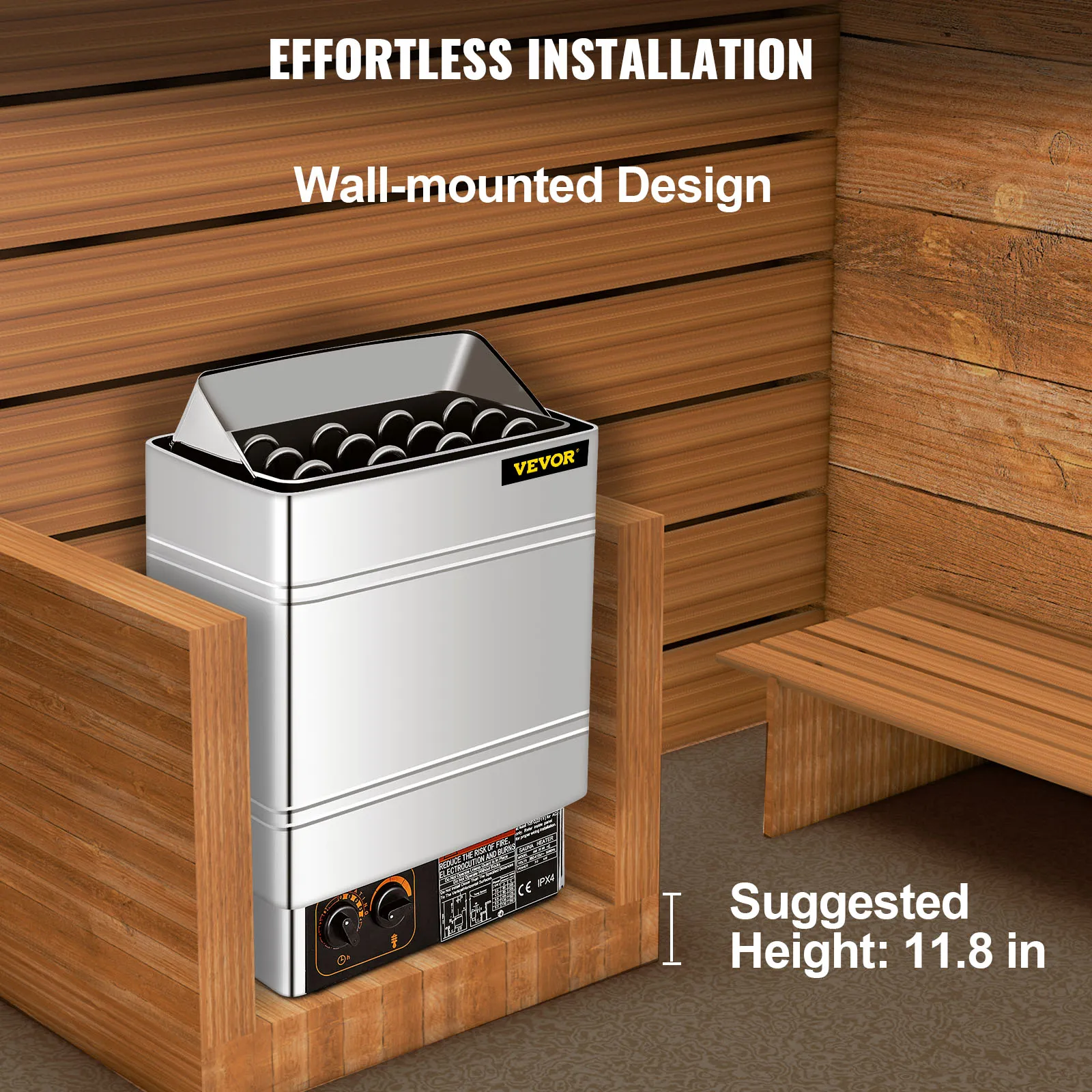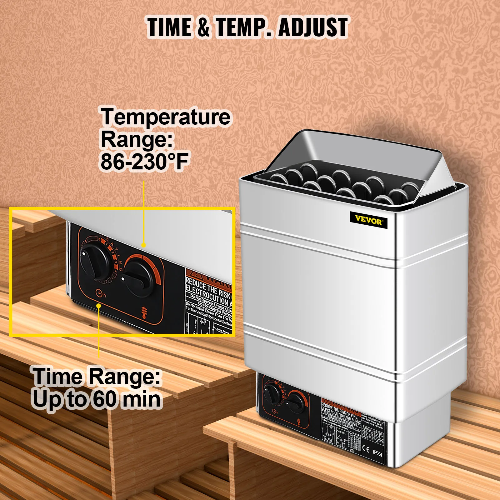 REGULACJA CZASU I TEMPERATURY: Piec do sauny suchej jest dobrze zbudowany i wyposażony w wewnętrzne elementy sterujące z wygodnymi pokrętłami do szybkiej regulacji, aby stworzyć wygodną saunę. Zakres czasu: 1 godzina. Uwaga: Efekt ogrzewania zależy od rzeczywistej wielkości pomieszczenia; może nie osiągnąć maksymalnej temperatury, jeśli pomieszczenie jest zbyt duże.