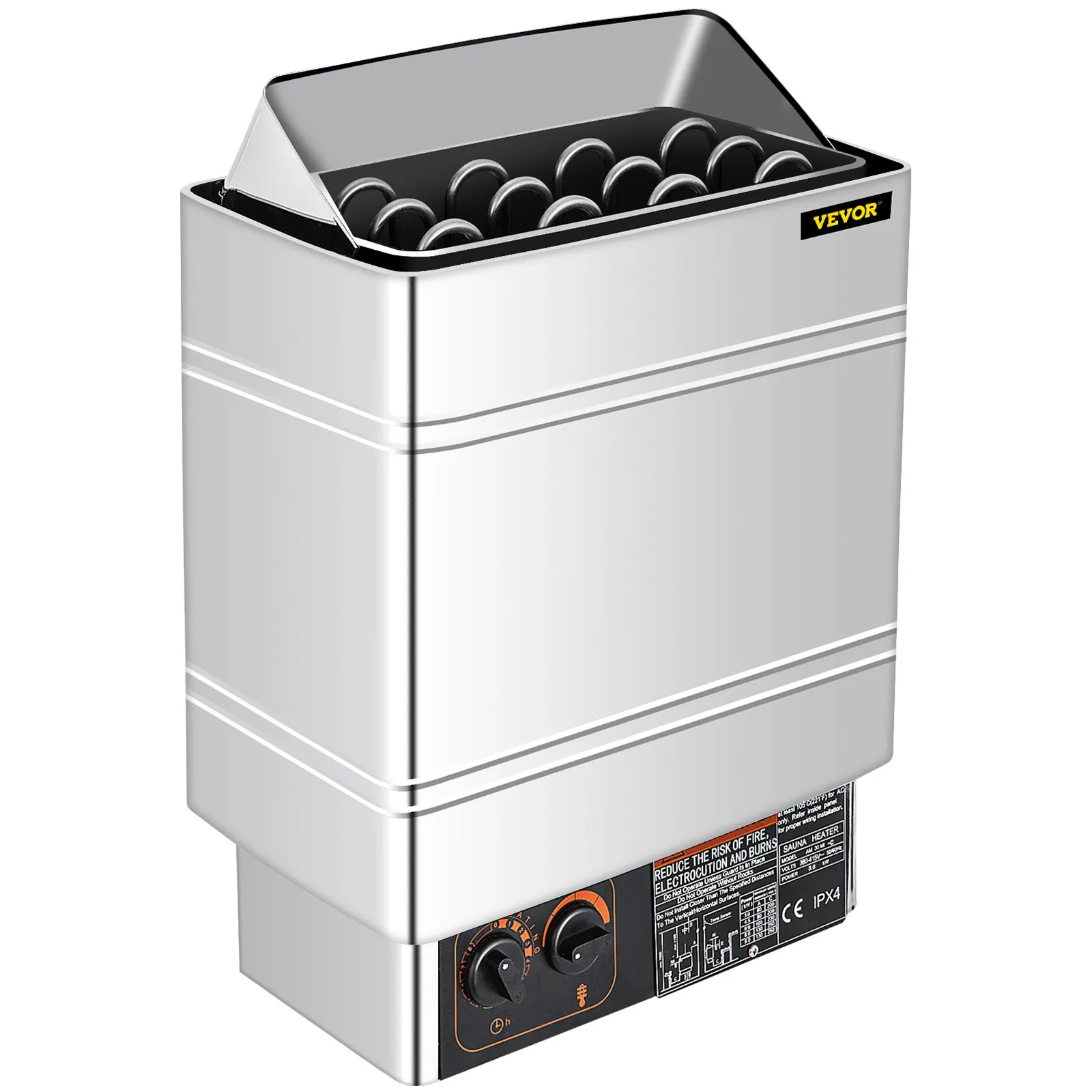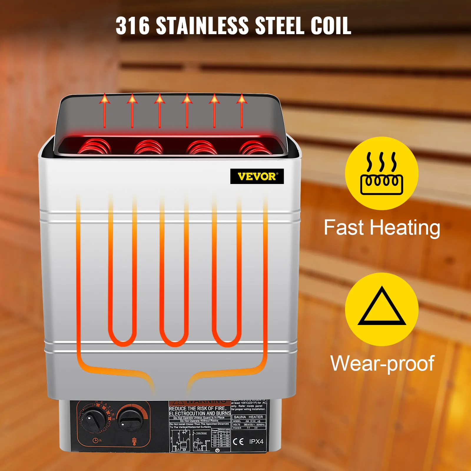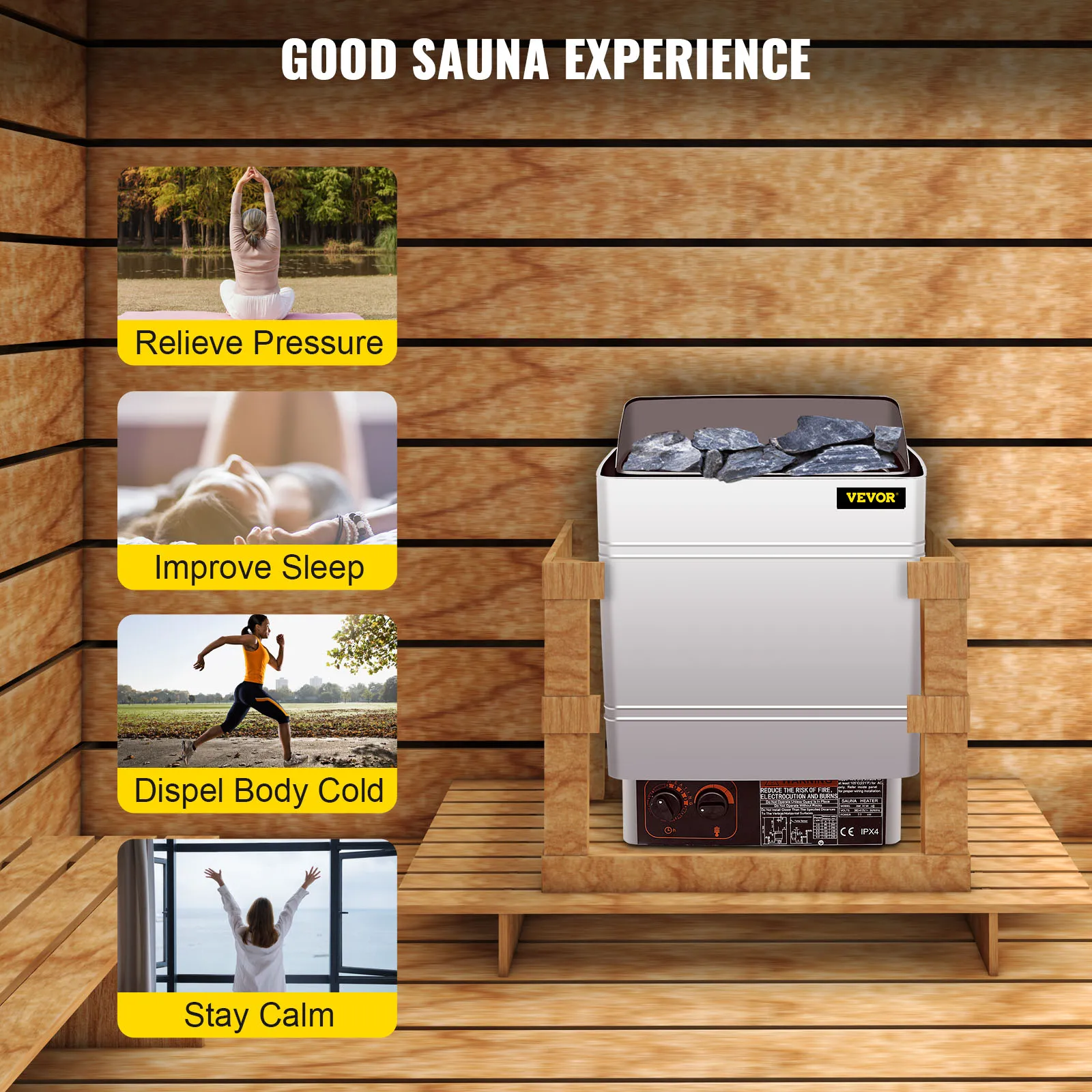 REGULACJA CZASU I TEMPERATURY: Piec do sauny suchej jest dobrze zbudowany i wyposażony w wewnętrzne elementy sterujące z wygodnymi pokrętłami do szybkiej regulacji, aby stworzyć wygodną saunę. Zakres czasu: 1 godzina. Uwaga: Efekt ogrzewania zależy od rzeczywistej wielkości pomieszczenia; może nie osiągnąć maksymalnej temperatury, jeśli pomieszczenie jest zbyt duże.