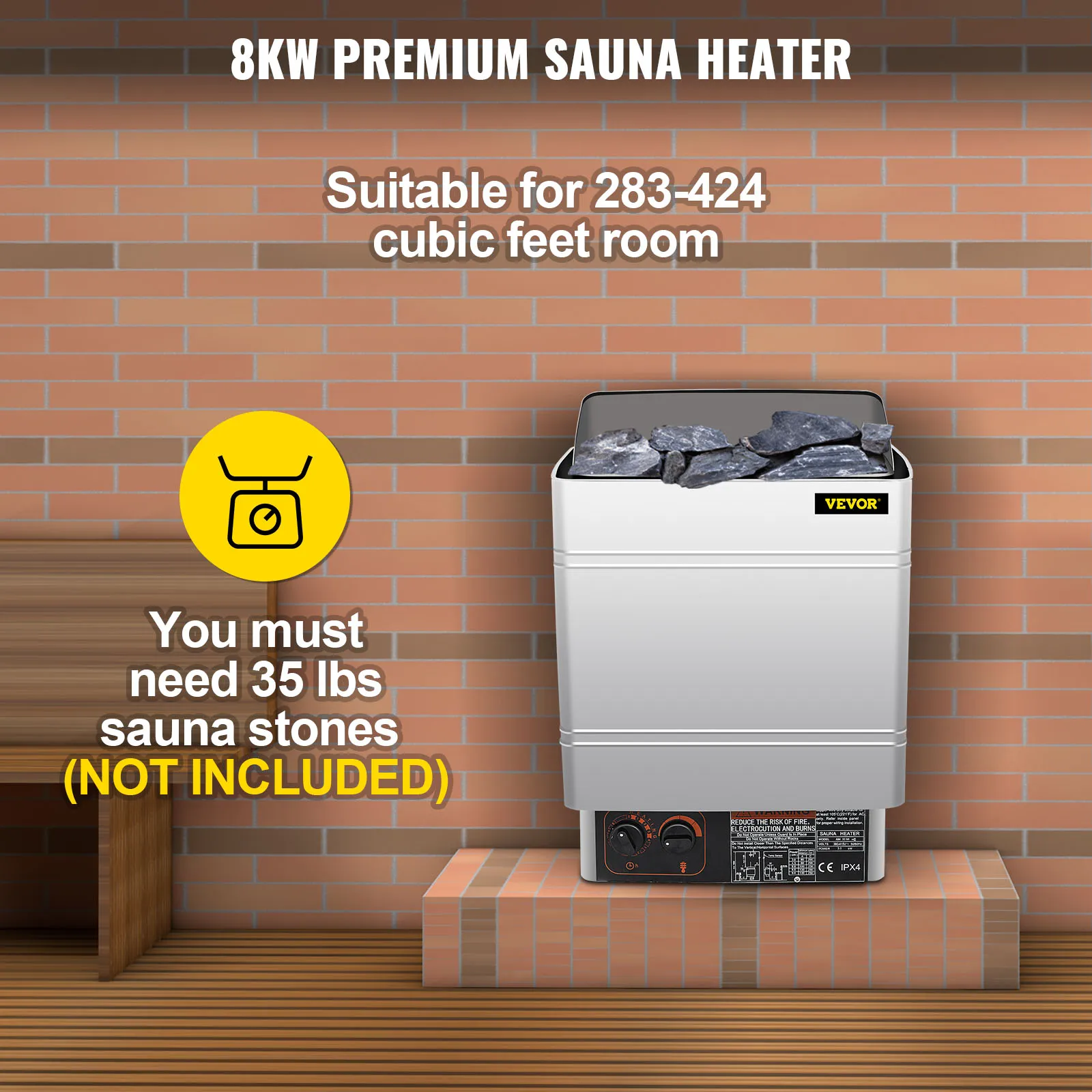 Wysokiej jakości piec do sauny: moc: 8 kW; Napięcie robocze: 380-415V; Prąd: 12,1A; odpowiednia sauna: 283-424 stóp sześciennych (8-12 m³), wysokość 6,2 stopy (190 cm); Wymagane kamienie do sauny: 35 funtów (16 kg); Zakres temperatur: 86-230 ℉ (30-110 ℃). Uwaga: kamienie do sauny NIE są objęte zakresem dostawy.