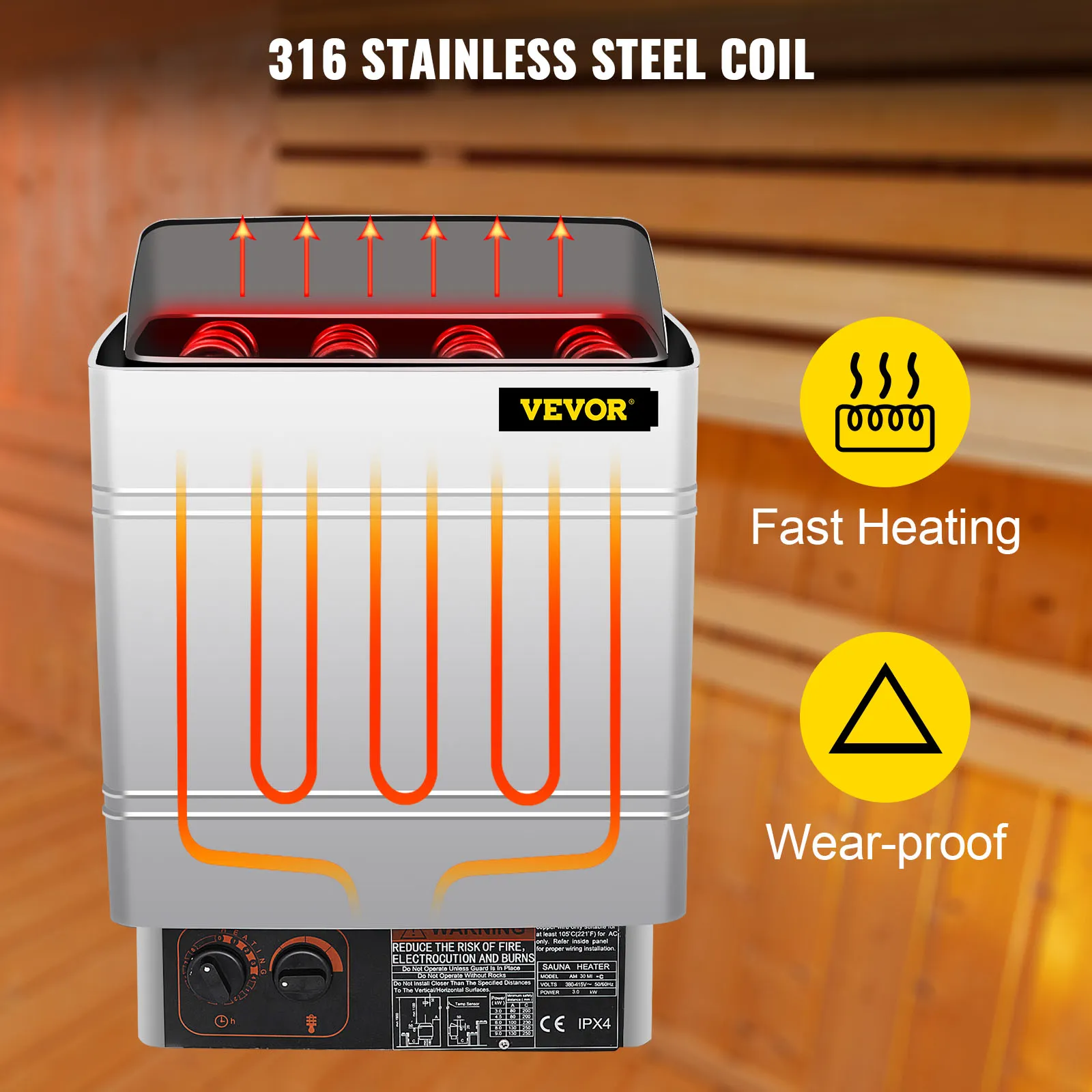 Piec do sauny suchej posiada dwie odporne na wysoką temperaturę wężownice grzewcze ze stali nierdzewnej 316, które zapewniają szybki efekt ogrzewania; W krótkim czasie można całkowicie się zrelaksować.
