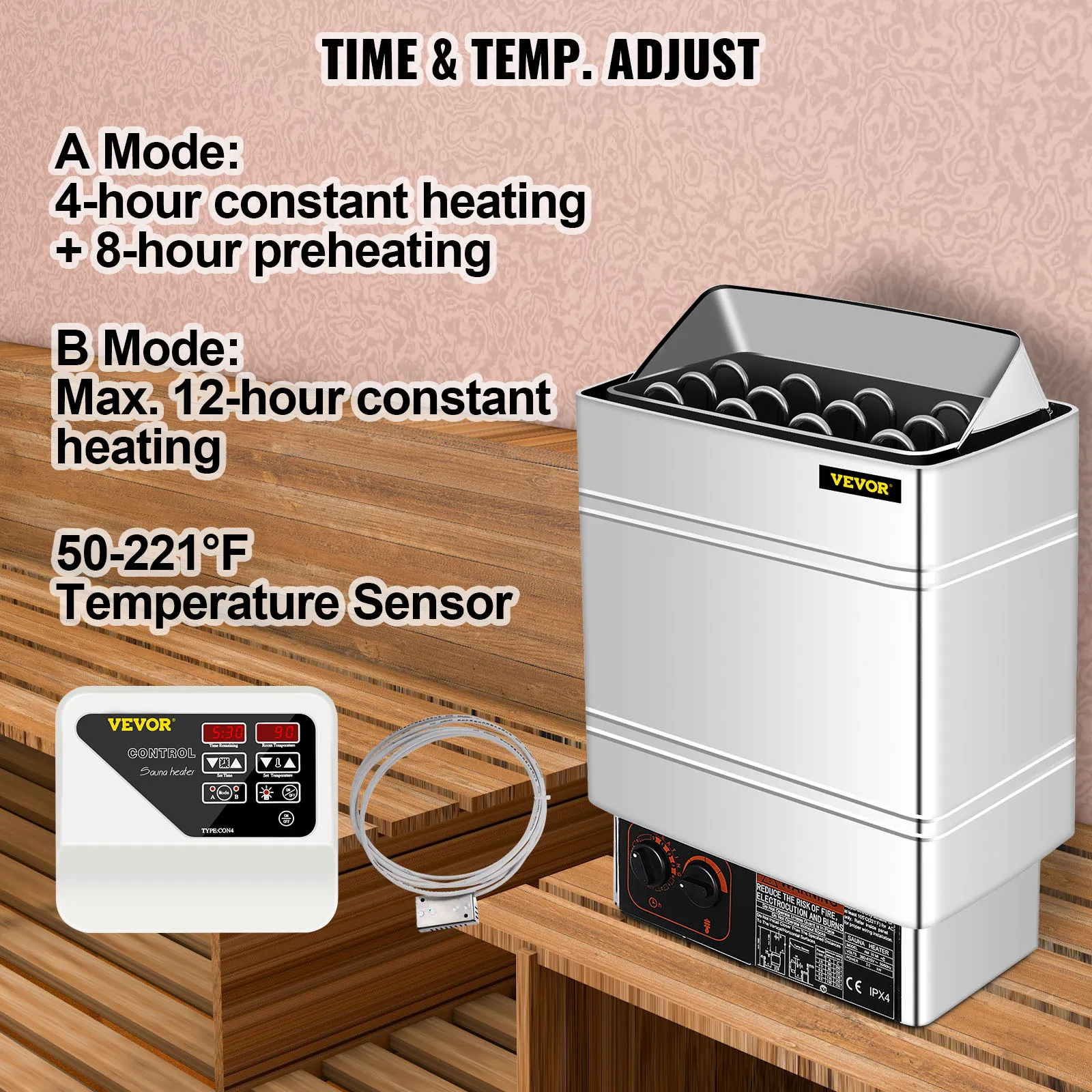 - Odpowiednia sauna: 283-424 stóp sześciennych / 8-12 m3 (6,2 stopy / 190 cm wysokości)