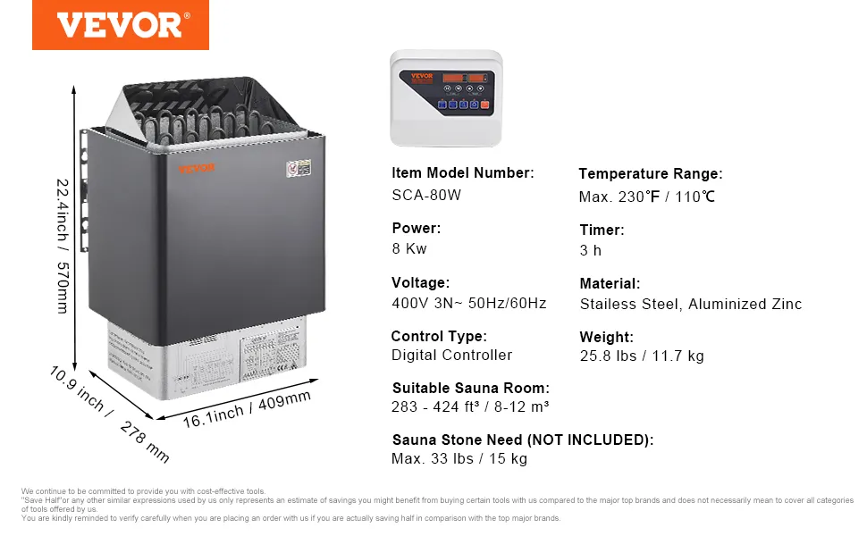 Piec do sauny VEVOR, 8 kW, 400 V, przenośny piec do sauny wewnętrznej i zewnętrznej 3N z 3-godzinnym timerem, sterowanie cyfrowe, do użytku domowego o kubaturze 8–12 m³, do użytku komercyjnego w hotelowych prysznicach spa, maks. 110°C
