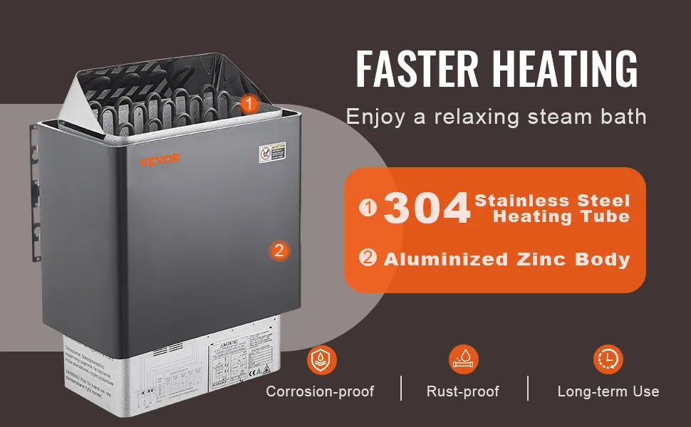 Trwała konstrukcja: Piec do sauny posiada aluminiowaną, cynkową obudowę, co zapewnia wysoką odporność na korozję i długą żywotność, nawet w środowiskach o wysokiej wilgotności. Element grzejny ze stali nierdzewnej 304 zapewnia szybkie i równomierne rozprowadzanie ciepła, zapewniając przyjemne doznania w saunie w krótkim czasie.