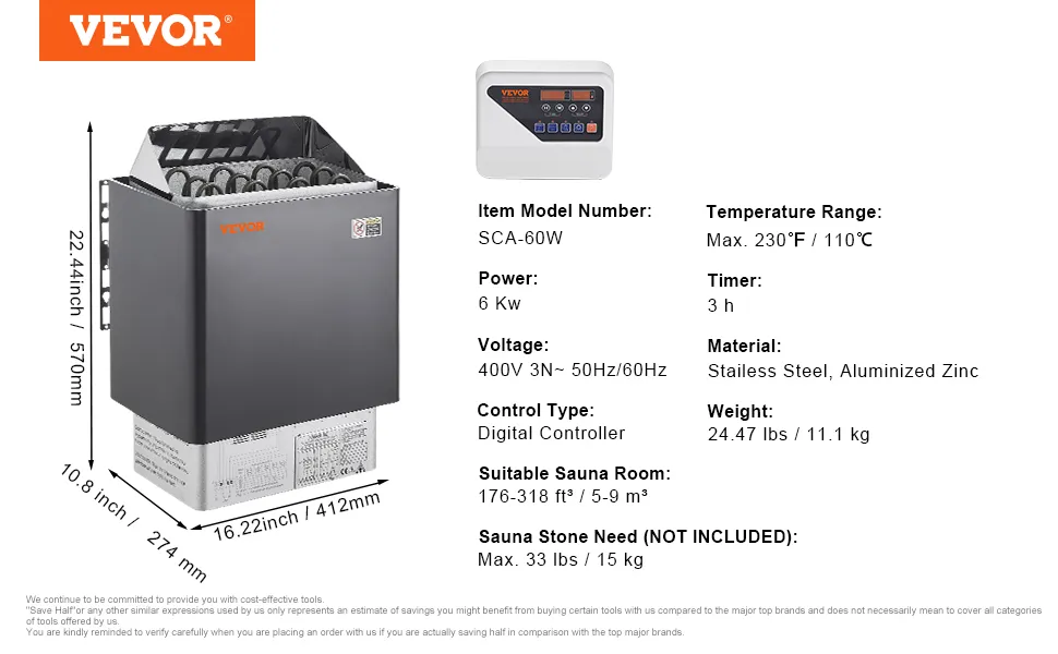 Piec do sauny VEVOR, 6 kW, 400 V, przenośny piec do sauny wewnętrznej i zewnętrznej 3N z 3-godzinnym timerem, cyfrowy sterownik do sauny o kubaturze 5-9 m³, do użytku domowego, komercyjnego w hotelowych prysznicach spa, maks. 110°C