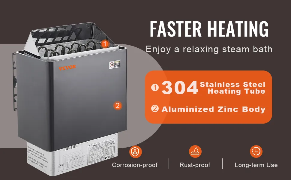 Trwała konstrukcja: Piec do sauny posiada aluminiowaną, cynkową obudowę, co zapewnia wysoką odporność na korozję i długą żywotność, nawet w środowiskach o wysokiej wilgotności. Element grzejny ze stali nierdzewnej 304 zapewnia szybkie i równomierne rozprowadzanie ciepła, zapewniając przyjemne doznania w saunie w krótkim czasie.