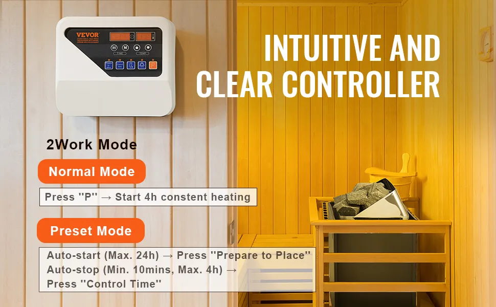 Sterowanie zewnętrzne: Zapewnia maksymalną wygodę dzięki zewnętrznemu sterowaniu umieszczonemu na zewnątrz sauny, z czytelnym wyświetlaczem i przyjaznym dla użytkownika interfejsem. Regulacja temperatury, czasu i innych ustawień jest niezwykle prosta dzięki intuicyjnemu sterowaniu. Do wyboru są dwa tryby: tryb normalny, zapewniający równomierne nagrzewanie do 4 godzin, lub tryb predefiniowany, z automatycznym uruchamianiem i zatrzymywaniem.