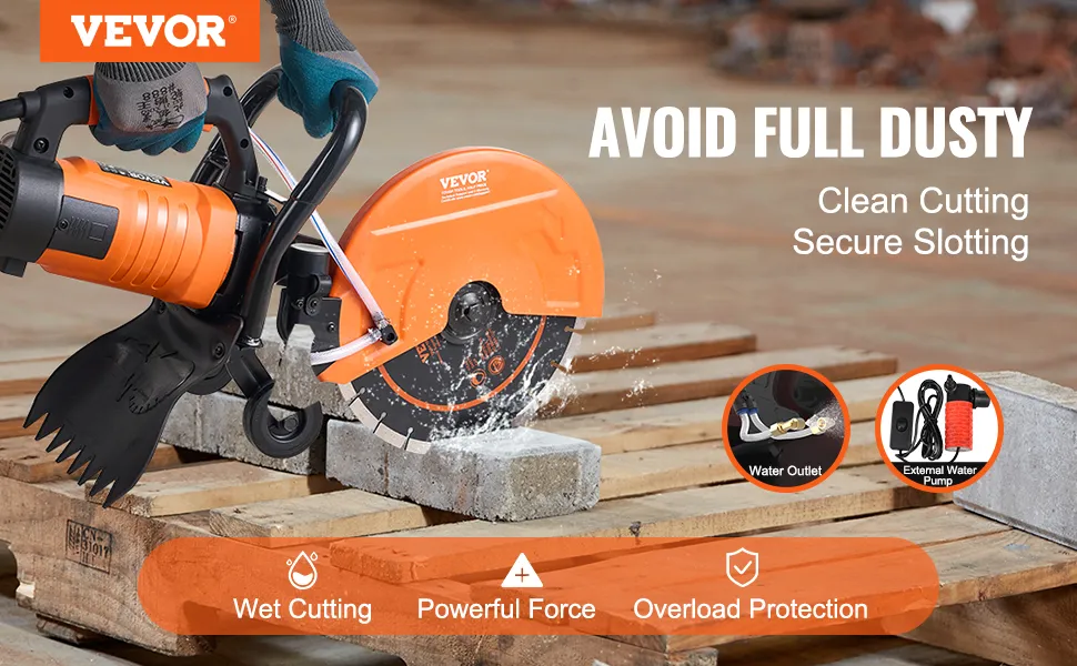 Elektryczna piła do betonu VEVOR z akcesoriami do cięcia na mokro zapewnia bardziej precyzyjne cięcie i zapobiega rozrzucaniu odłamków. Wyposażona jest również w podwójny wyłącznik i zabezpieczenie przed przeciążeniem, co zapewnia bezpieczniejszą pracę.