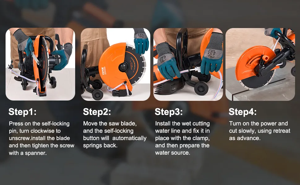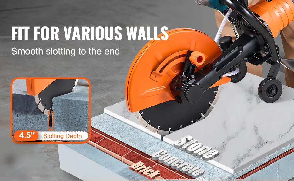 Przetnij wszystko: Nasza piła do betonu ma głębokość cięcia 4,5 cala (114 mm), dzięki czemu nadaje się do cięcia różnych materiałów betonowych, takich jak kamień, beton zbrojony, kostka brukowa i cegły. Uwaga: Zaleca się wykonywanie operacji cięcia prądem o natężeniu 30 A. (Przy natężeniu 15 A, jednorazowa głębokość cięcia nie powinna przekraczać 50 mm (2 cali). Jeśli wymagane są cięcia powyżej 50 mm (2 cali), należy wykonać kilka przejść.)