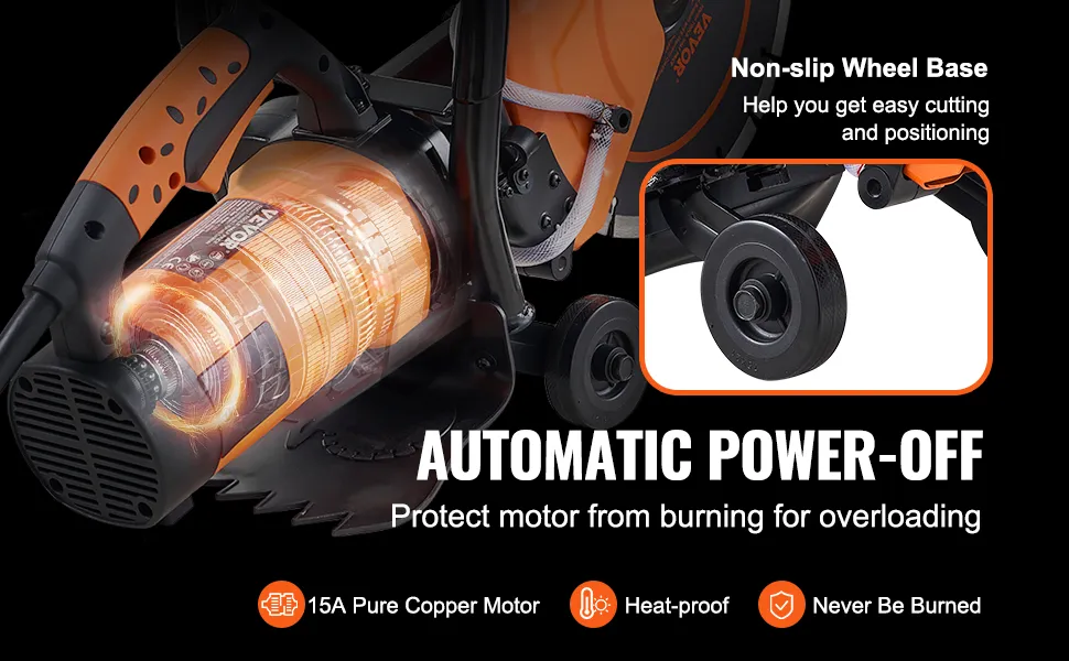 Nasza elektryczna piła do betonu jest wyposażona w zabezpieczenie, które zapobiega przegrzaniu silnika z powodu nadmiernej mocy. Silnik z czystej miedzi o natężeniu prądu 15 A jest odporny na wysokie temperatury, co zapewnia dłuższą żywotność.