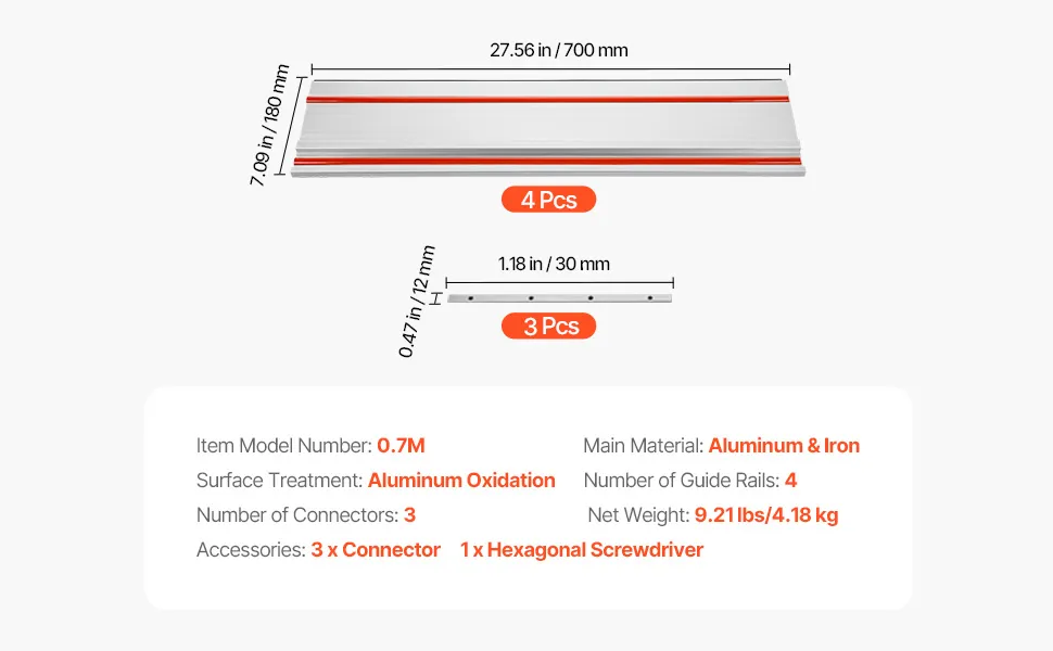 Prowadnica do piły zagłębiarskiej VEVOR, 700 x 180 mm, zestaw 4 prowadnic aluminiowych i 3 łączników, kompatybilny z piłami zagłębiarskimi Makita, Festool i WEN, do obróbki drewna