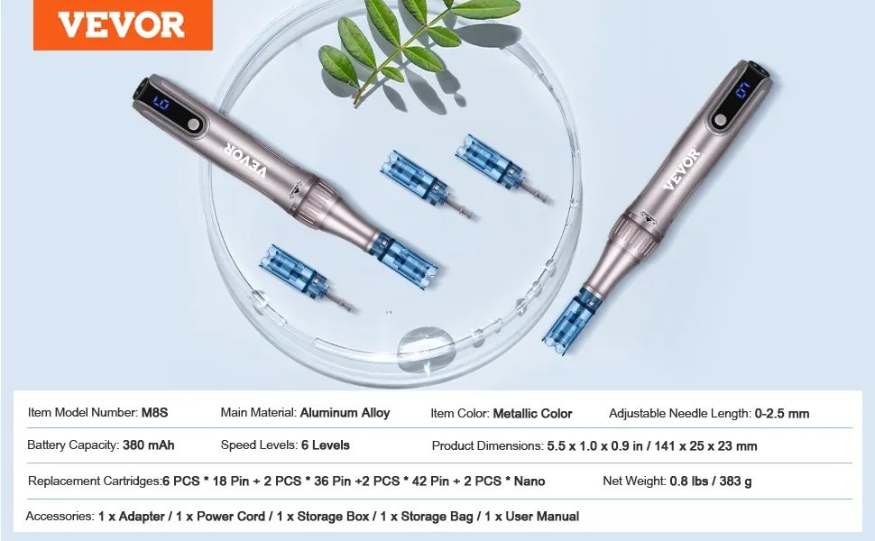 Odkryj swój blask: profesjonalny pen do mikronakłuwania VEVOR M8S skutecznie poprawia tkankę skórną, wspomaga wchłanianie produktu, rozjaśnia blizny i plamy starcze oraz poprawia elastyczność skóry. W zestawie znajduje się 6 wymiennych wkładów antyrefluksowych z 18 igłami, 2 igłami z 36 igłami, 2 igłami z 42 igłami i 2 igłami z nanocząsteczkami. Idealne do leczenia blizn potrądzikowych, żółtawych plam, problemów z pigmentacją, zmarszczek i codziennej pielęgnacji skóry.
