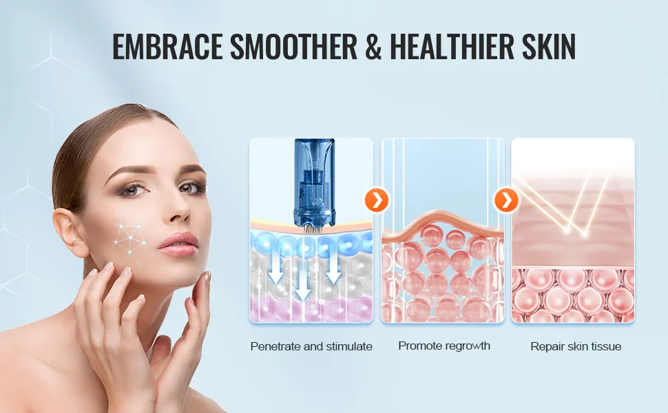 Popraw kondycję swojej skóry dzięki mikronakłuwaczowi, który przyspiesza wchłanianie produktu, rozjaśnia cerę, zwęża pory i poprawia elastyczność skóry. Niezależnie od tego, czy leczysz matową skórę, czy drobne zmarszczki, ten mikronakłuwacz zapewnia zauważalną poprawę.