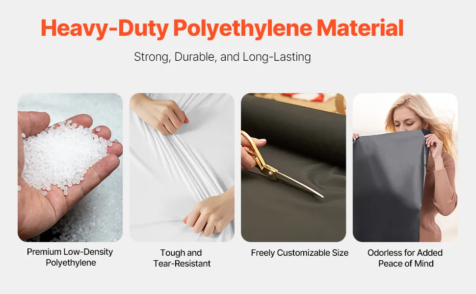 Wyjątkowa trwałość i odporność na warunki atmosferyczne: Wykonana z polietylenu o grubości 6 mil / 0,15 mm, ta folia plastikowa oferuje doskonałą wytrzymałość i trwałość. Jest odporna na rozdarcia i trudne warunki, takie jak silny wiatr, niskie temperatury i ekstremalne nasłonecznienie, zapewniając długą żywotność.