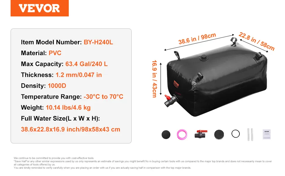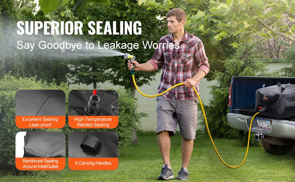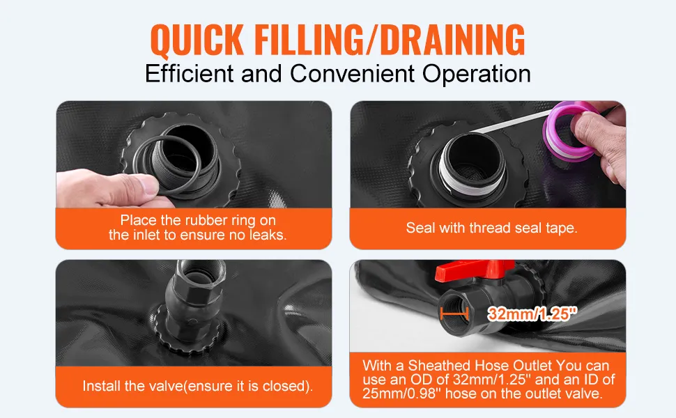 Wygodny i wydajny: Aby zwiększyć komfort użytkowania, ten przenośny zbiornik na wodę jest wyposażony w tuleję wylotową na wąż. Jest kompatybilny z wężami o średnicy zewnętrznej 32 mm/1,25 cala i wewnętrznej 25 mm/0,98 cala i nie wymaga użycia profesjonalnych narzędzi do montażu, dzięki czemu proces magazynowania wody jest prosty i wydajny.