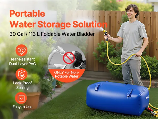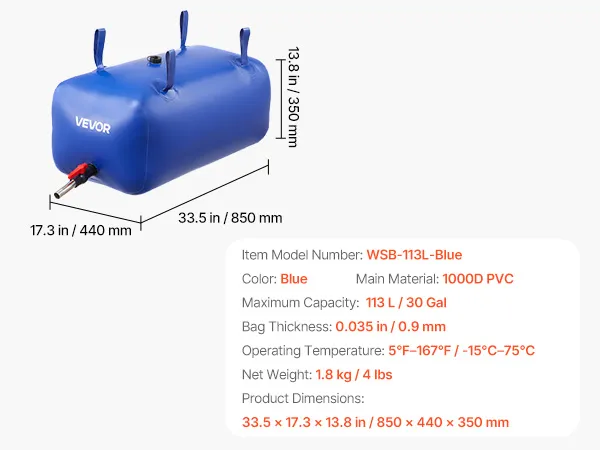Zbiornik na wodę o pojemności 113 l (30 galonów): Ten zbiornik na wodę z PVC ma wymiary 33,5 x 17,3 x 13,8 cala / 850 x 440 x 350 mm i mieści do 113 l (30 galonów). Idealny do nawadniania ogrodu, kempingu, uzupełniania wody w kamperach i awaryjnego przechowywania wody. W zestawie znajduje się kompletny zestaw akcesoriów, w tym zawór kranowy, złącze 3/4 cala, złączki i łatka naprawcza ułatwiająca użytkowanie.