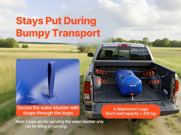 Trzymaj pojemnik na wodę bezpiecznie w skrzyni ładunkowej swojego samochodu dostawczego, w bagażniku SUV-a lub na dachu, aby zapobiec jego ślizganiu się lub stoczeniu podczas jazdy po wyboistych drogach i zachować stabilny środek ciężkości.