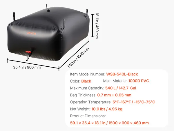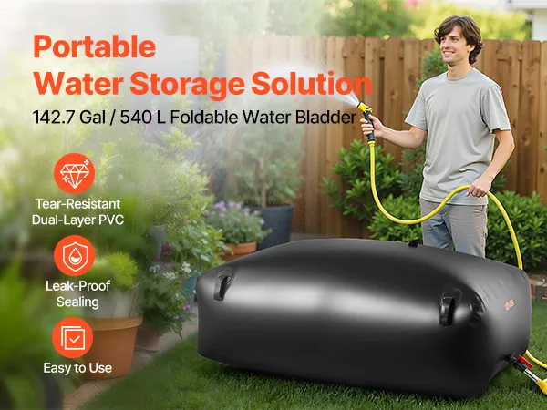 VEVOR Worek do przechowywania wody, 540 l, miękki worek z PVC, pojemnik do przechowywania wody, szczelny i odporny na zużycie zbiornik na wodę do nawadniania zewnętrznego w kamperach i ciężarówkach, do użytku w sytuacjach awaryjnych