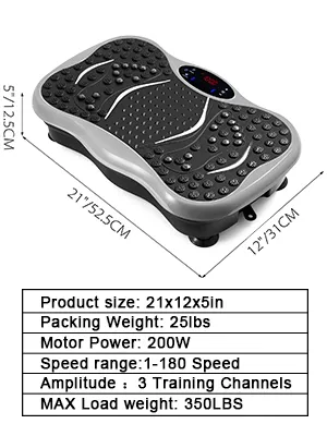 Nadal szukasz łatwiejszego sposobu na ćwiczenia lub utratę wagi? Nasza płyta wibracyjna do treningu całego ciała ma 180 poziomów prędkości i 3 metody treningowe. 10 minut wibracji dziennie, 3 razy w tygodniu. Na metabolizm, spalanie kalorii, poprawę krążenia krwi, zwiększenie gęstości kości, a także wzmocnienie organizmu.