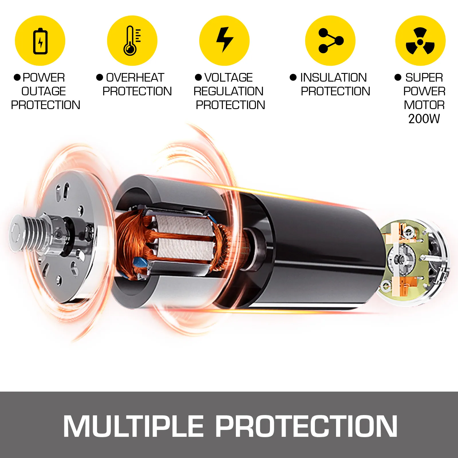 Twoje bezpieczeństwo jest zawsze na pierwszym miejscu. Wysokiej jakości, całkowicie miedziany silnik o mocy 200 W ma wysoką wydajność i pracuje dobrze i cicho.