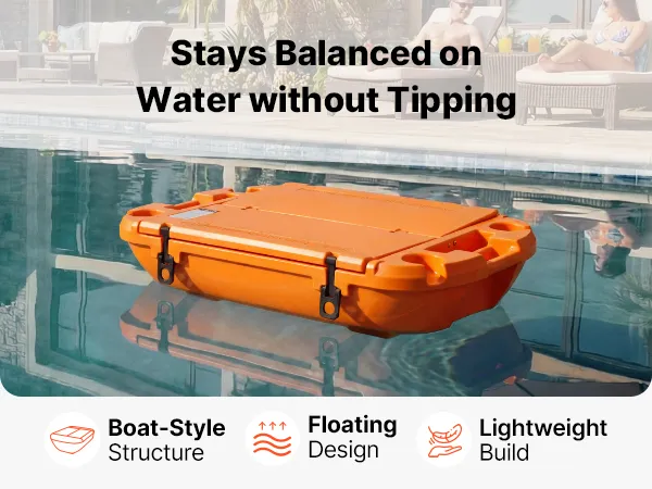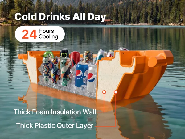 Ta pływająca lodówka turystyczna ma solidną powłokę zewnętrzną i grubą izolację, co zapewnia długotrwałe chłodzenie. Nadaje się do użytku na zewnątrz i na słońcu, utrzymując lód na dłużej, dzięki czemu Twoje jedzenie i napoje pozostają zimne.
