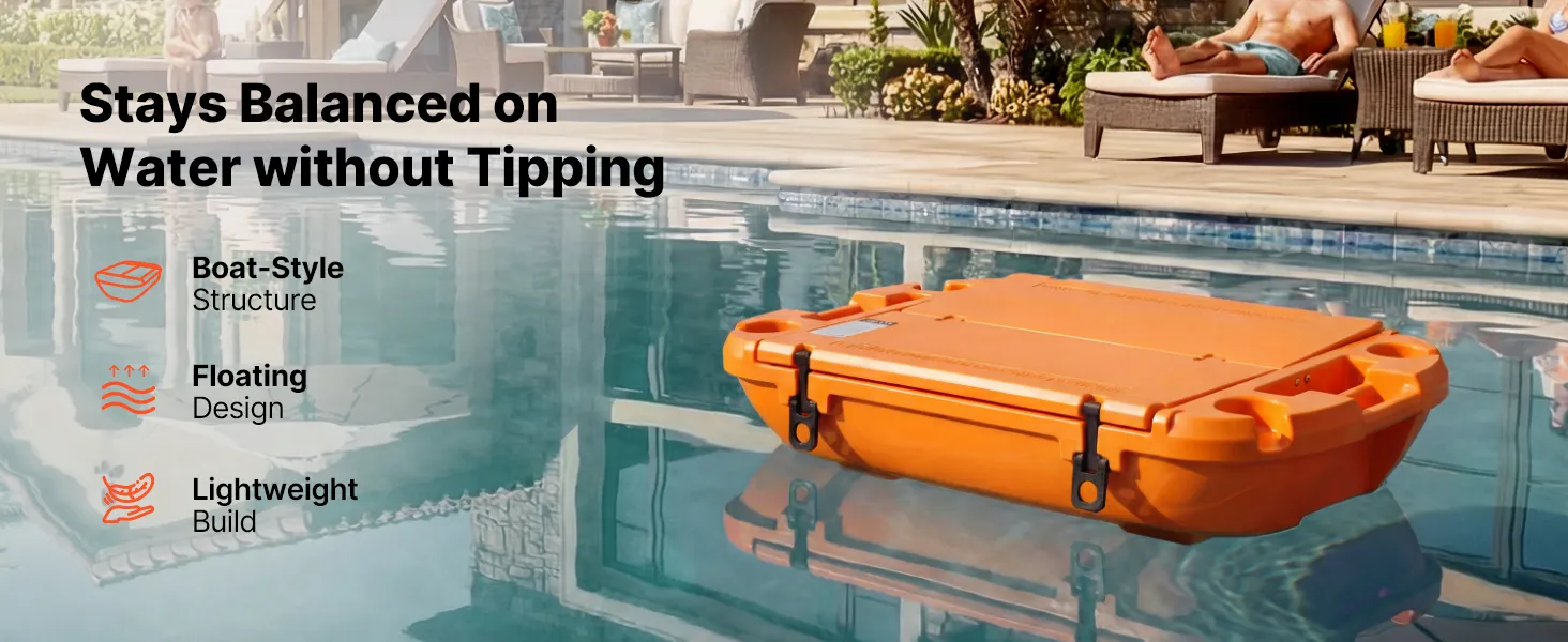 Pływająca lodówka turystyczna w stylu łodzi z szeroką podstawą zapewnia stabilność i bezpiecznie unosi się na wodzie nawet przy pełnym obciążeniu. Konstrukcja przypominająca kadłub łodzi zmniejsza ryzyko przewrócenia, ułatwiając dostęp i holowanie.