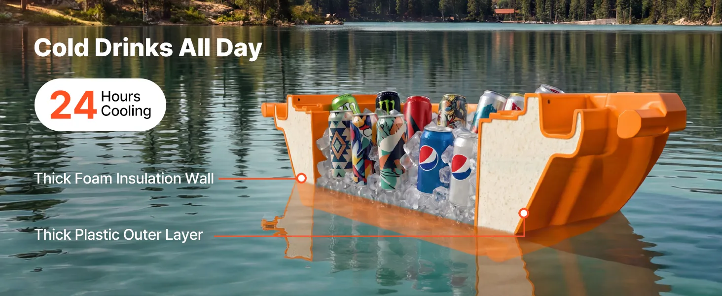 Pływająca lodówka turystyczna o pojemności 37,9 l dla grup: Pomieści lód, puszki i przekąski dla wszystkich. Kadłub w kształcie łódki zapewnia stabilność na wodzie, zapobiegając przewróceniu się lodówki podczas sięgania po napoje.
