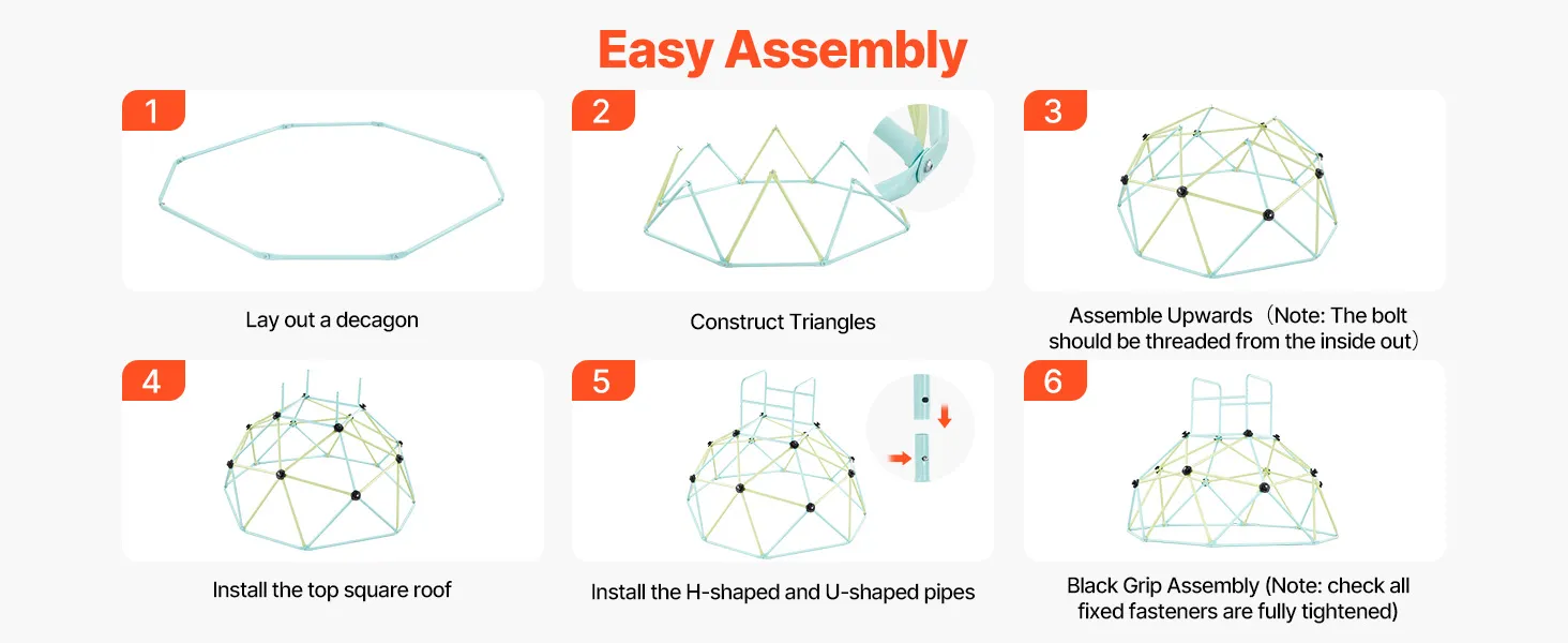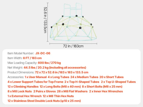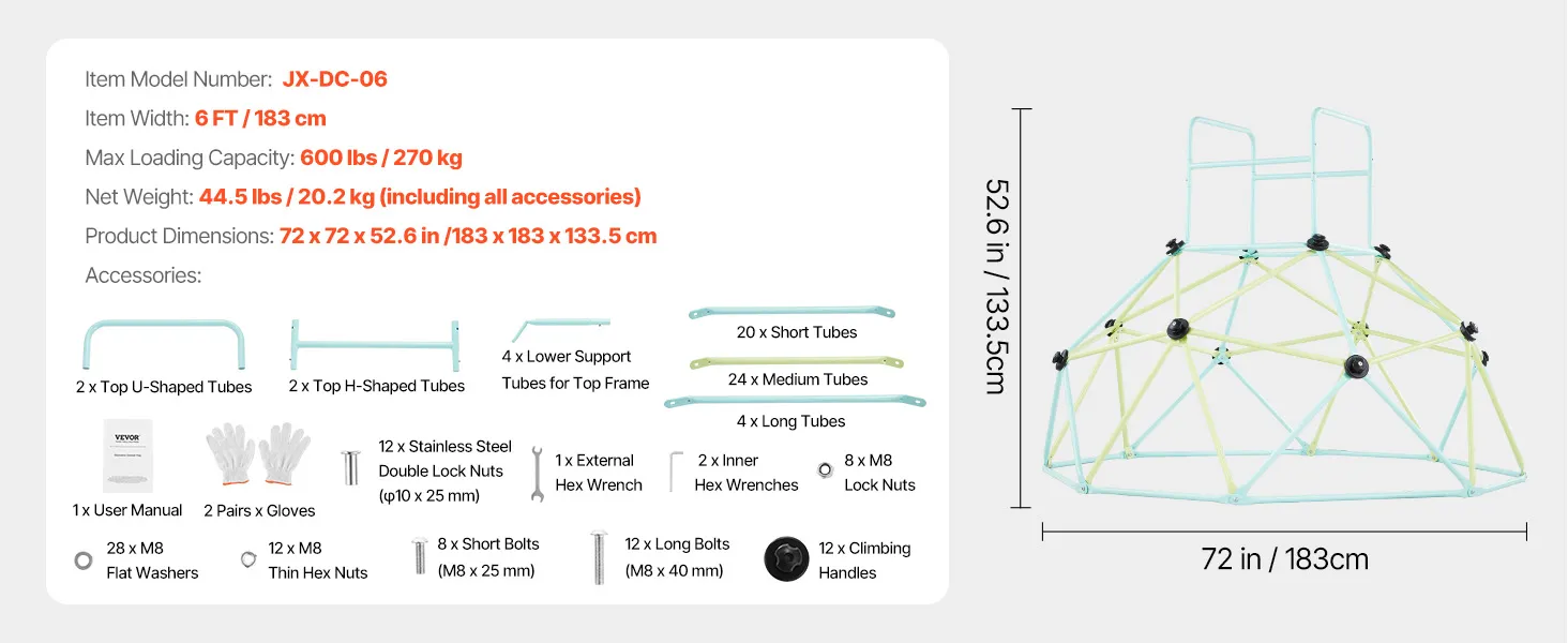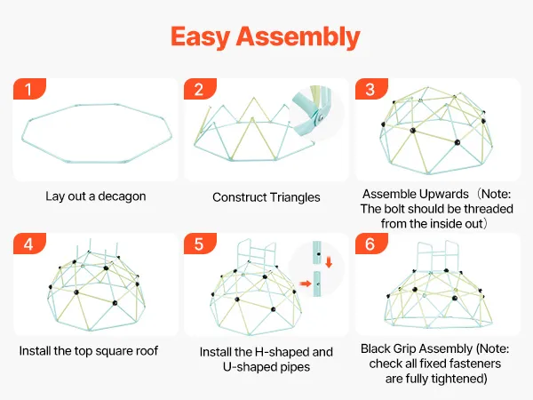 Łatwy montaż: Z rękawiczkami, kluczem i szczegółową instrukcją szybko zbudujesz bezpieczną kopułę wspinaczkową dla swojego dziecka. Można ją łatwo transportować w domu lub na zewnątrz, co pozwala cieszyć się zabawą bez ograniczeń przestrzennych (Uwaga: montaż i użytkowanie muszą odbywać się na płaskiej powierzchni).