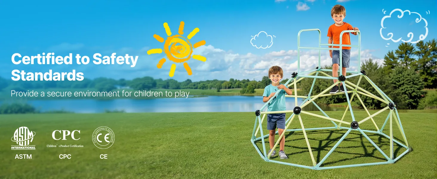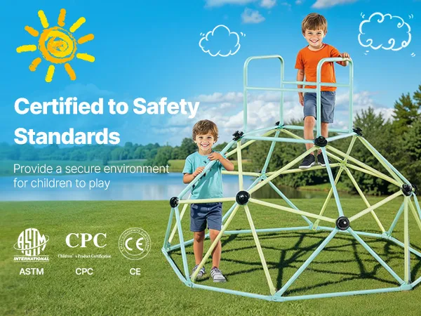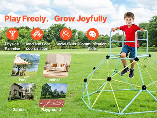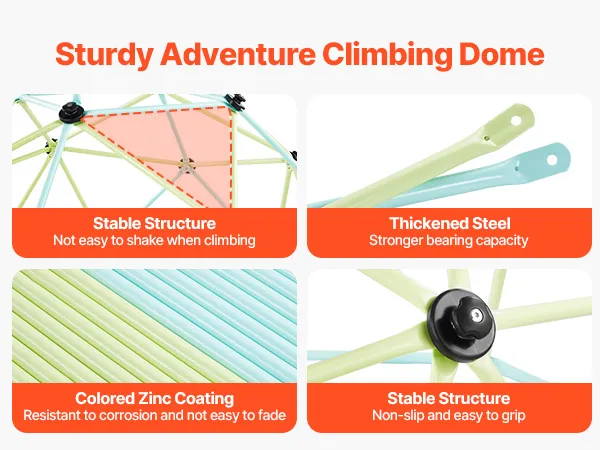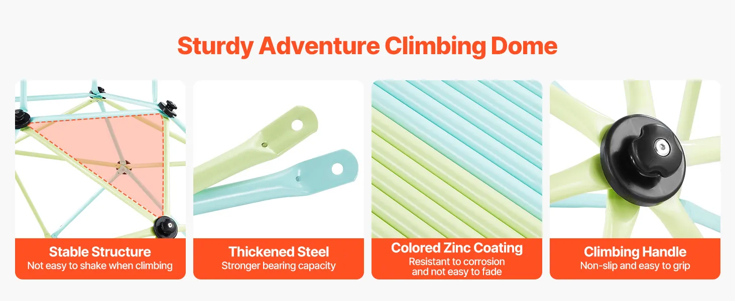 Bezpieczeństwo przede wszystkim: Bezpieczeństwo dzieci jest naszym najwyższym priorytetem. Dzięki tej geometrycznej kopule wspinaczkowej dzieci mogą bezpiecznie i swobodnie eksplorować wieżę wspinaczkową. Antypoślizgowe i łatwe w trzymaniu uchwyty zapewniają bezpieczną wspinaczkę, a gładkie, pozbawione zadziorów rurki zapobiegają zarysowaniom.