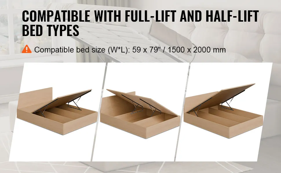 Ten hydrauliczny zestaw do podnoszenia łóżka jest odpowiedni do sof i łóżek o wymiarach 150 x 200 cm. Mechanizm można regulować, aby otwierał się z boku lub od strony stóp łóżka.